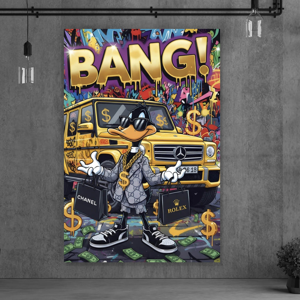 Dieses beeindruckende Wandbild vereint Elemente von Pop Art und modernem Stil, indem es eine ikonische Ente darstellt, die vor einem luxuriösen Auto posiert. Die Ente trägt auffällige Markenbekleidung und Accessoires, die sofort ins Auge springen und einen Hauch von Glamour und Luxus ausstrahlen. Umgeben von symbolträchtigen Logos und Geldscheinen erzeugt das Bild eine dynamische und lebendige Atmosphäre, die den Betrachter in eine Welt des Reichtums und der Opulenz entführt. Der Hintergrund ist mit Graffiti-Elementen und farbenfrohen Spritzern gestaltet, die der Szene Tiefe und Bewegung verleihen. Die Kombination aus bekannten Markensymbolen und urbanem Design macht dieses Bild zu einem echten Hingucker, der in jedem Raum ein modernes und trendiges Ambiente schafft. Die Darstellung spielt mit Humor und Extravaganz und ist ideal für Räume, die einen kreativen und modischen Akzent benötigen. Die Materialanmutung ist hochwertig und vermittelt eine hochwertige und edle Ausstrahlung. Dieses Kunstwerk ist perfekt für alle, die ein starkes Statement setzen möchten und ihren Raum mit einem einzigartigen und stilvollen Kunstwerk bereichern wollen.