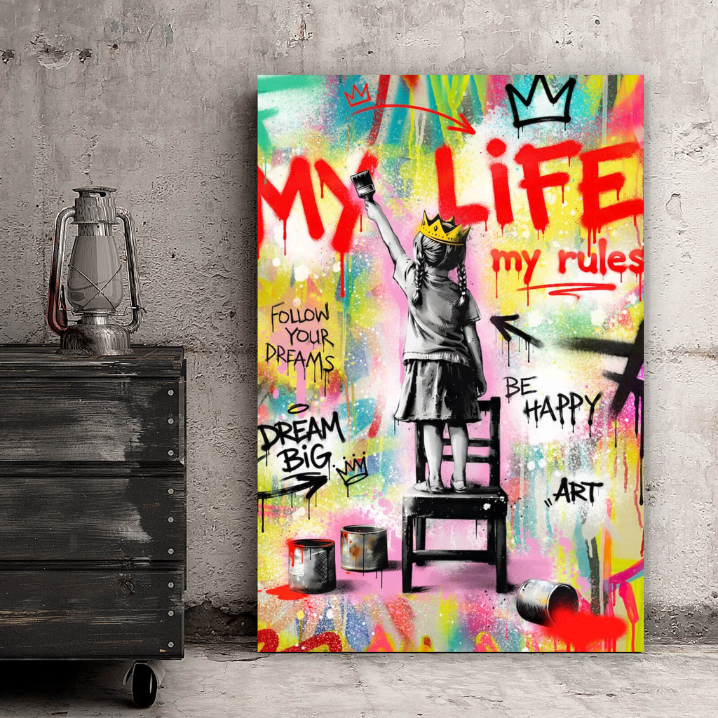 Das Bild zeigt ein modernes Streetart-Wandbild, das mit seinem inspirierenden Text und lebhaften Stil eine starke Aussage trifft. Im Zentrum steht ein Mädchen auf einem Stuhl, das mit einer Krone auf dem Kopf und einem Pinsel in der Hand den Schriftzug „My Life, My Rules“ malt. Der Hintergrund ist eine dynamische Collage aus verschiedenen Graffiti-Elementen und Sprüchen wie „Follow Your Dreams“ und „Be Happy“, die das Thema der Selbstbestimmung und Kreativität unterstreichen. Die Darstellung des Mädchens in einem Banksy-ähnlichen Stil verleiht dem Bild eine moderne und urbane Anmutung. Die Verwendung von Schablonentechnik und die Kombination mit freihändigem Graffiti schaffen eine spannende Tiefe und verleihen dem Kunstwerk eine ausdrucksstarke Raumwirkung. Das Wandbild eignet sich perfekt für Räume, die eine energetische und kreative Atmosphäre ausstrahlen sollen, wie Wohnzimmer, Büros oder Kinderzimmer. Es ist ein starkes Statement für Individualität und künstlerische Freiheit und spricht besonders Menschen an, die sich von konventionellen Normen lösen und ihren eigenen Weg gehen möchten.