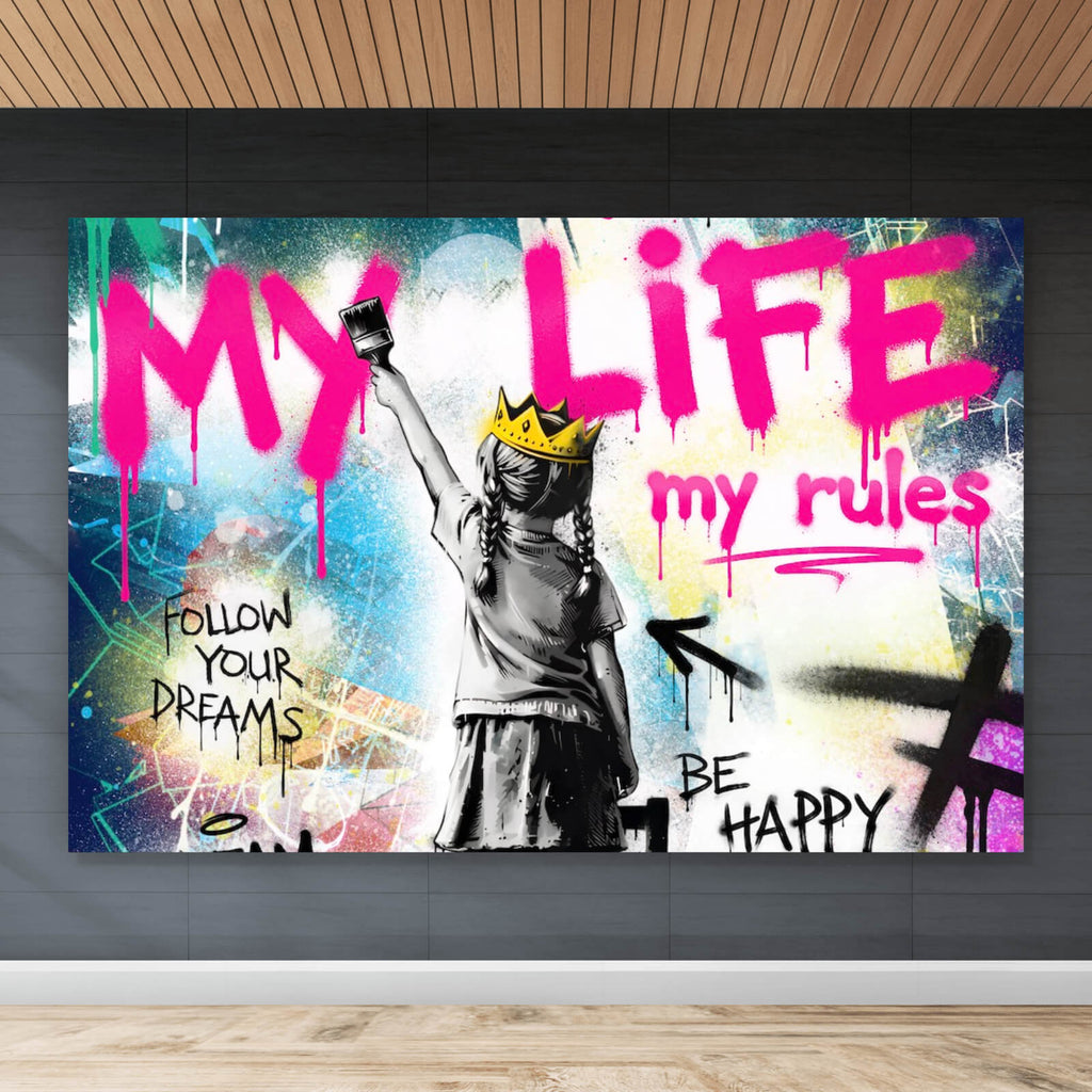 Dieses beeindruckende Wandbild vereint Graffiti-Technik mit stark motivierenden Botschaften und ist ein Paradebeispiel für moderne Kunst. Im Zentrum steht ein Mädchen auf einem Stuhl, das mit einer Krone auf dem Kopf seine Träume manifestiert. Umgeben von inspirierenden Worten wie "My Life, My Rules" wird eine kraftvolle Botschaft der Selbstbestimmung und Kreativität vermittelt. Die dynamischen Formen und die Verwendung von Sprühtechnik verleihen dem Bild eine lebendige Tiefe und einen urbanen Charakter, der perfekt in moderne Wohn- und Arbeitsräume passt. Der Einfluss von Streetart ist unverkennbar und bringt eine rebellische, dennoch inspirierende Stimmung in jeden Raum. Die Anmutung des Materials suggeriert eine Mischung aus Freiheit und Struktur und zieht den Betrachter in seinen Bann. Ideal für diejenigen, die einen Hauch von Individualität und Ausdruckskraft in ihre Umgebung integrieren möchten. Dieses Kunstwerk ist nicht nur ein visuelles Statement, sondern auch eine tägliche Erinnerung daran, die eigenen Träume zu verfolgen und mutig zu sein. Es ist perfekt für kreative Umgebungen wie Büros, Wohnzimmer oder Jugendzimmer, wo es als starker visueller Anker dient und gleichzeitig eine inspirierende Atmosphäre schafft.