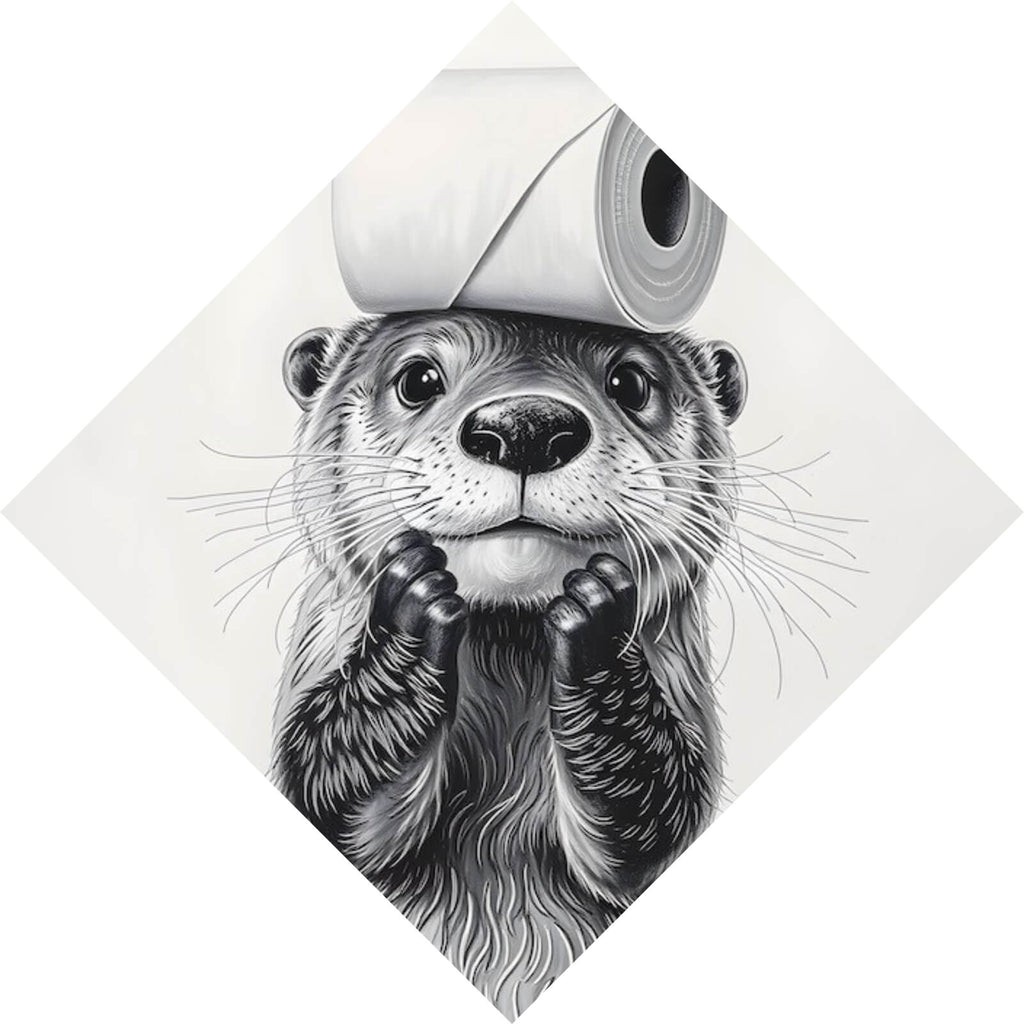 Auf dem Bild ist eine bezaubernde Zeichnung eines Otters zu sehen, der auf humorvolle Weise eine Rolle Toilettenpapier auf dem Kopf balanciert. Der Otter ist in einem monochromen Schwarz-Weiß-Stil illustriert, was der Darstellung einen klassischen und stilvollen Look verleiht. Seine großen, neugierigen Augen und die leicht hochgezogenen Pfoten lassen ihn besonders niedlich und verspielt erscheinen. Die Details in seinem Fell sind sorgfältig ausgearbeitet, wodurch der Otter lebendig und realistisch wirkt. Das Toilettenpapier, das untypisch auf dem Kopf des Tieres platziert ist, fügt dem Bild eine humorvolle Note hinzu, die den Betrachter zum Schmunzeln bringt. Die gesamte Komposition ist minimalistisch gehalten, mit einem glatten, hellen Hintergrund, der den Fokus vollständig auf den charmanten Otter lenkt. Diese Illustration eignet sich hervorragend als dekoratives Element in einem modernen Raum oder als Teil einer humorvollen Kunstsammlung. Sie spricht Tierliebhaber und Kunstfreunde gleichermaßen an und vermittelt eine fröhliche, unbeschwerte Stimmung.