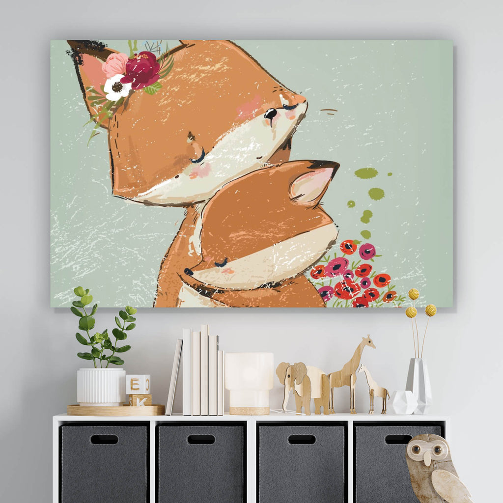 Das Wandbild zeigt eine liebevolle Szene zweier Füchse in inniger Umarmung, die perfekt geeignet ist, um eine warme und einladende Atmosphäre im Kinderzimmer zu schaffen. Diese Illustration strahlt eine bezaubernde Niedlichkeit aus, die sowohl Kinder als auch Erwachsene anspricht. Der sanfte Stil und die harmonische Darstellung der Tiere vermitteln ein Gefühl von Geborgenheit und Ruhe, ideal für eine entspannende Umgebung. Die detaillierte Ausarbeitung der Fuchsgesichter und die Anordnung der Blumen im Hintergrund verleihen dem Bild eine lebendige Tiefe und machen es zu einem Blickfang an jeder Wand. Die Komposition des Bildes eignet sich hervorragend als zentrales Dekorationselement und kann wunderbar mit anderen Natur- und Tiermotiven kombiniert werden. Dieses Kunstwerk ist nicht nur dekorativ, sondern auch inspirierend, da es die Schönheit und Harmonie der Natur in einem modernen Kontext einfängt. Die Verwendung von verspielten Formen und die sanfte Linienführung erhöhen die visuelle Attraktivität und machen es zu einem stilvollen Accessoire für jedes Zuhause. Ideal für Familien, die nach einer kreativen und stilvollen Möglichkeit suchen, ihre Räume zu gestalten.