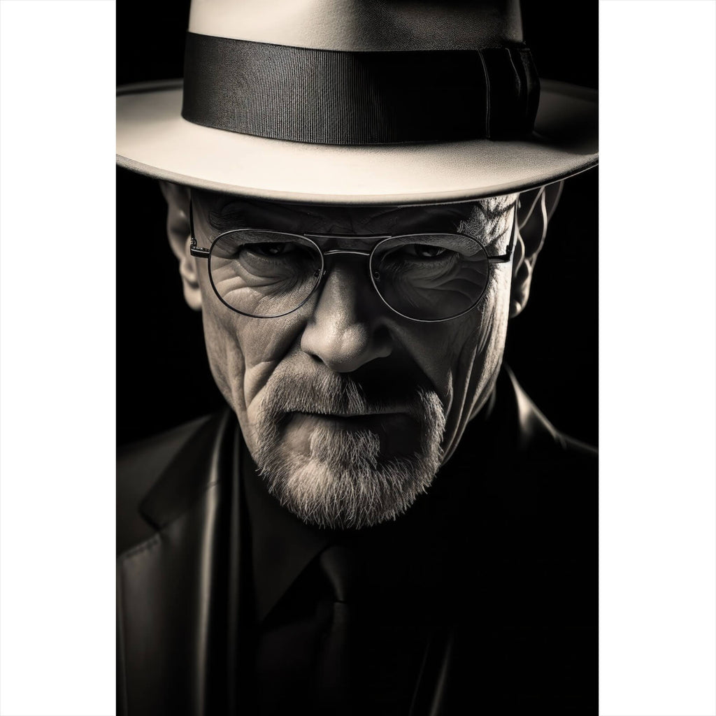 Das Bild zeigt ein eindrucksvolles Porträt eines Mannes mit markanten Gesichtszügen, der einen eleganten Hut und eine Brille trägt. Die Darstellung ist in einem modernen und stilvollen Kunststil gehalten, der dem Bild eine zeitlose Eleganz und Tiefe verleiht. Die feinen Details im Gesicht und der Ausdruck des Mannes vermitteln eine starke Präsenz und Charisma, was das Bild zu einem Blickfang in jedem Raum macht. Die klaren Konturen und der Fokus auf die Gesichtszüge erzeugen eine faszinierende Atmosphäre, die sowohl Ruhe als auch Intensität ausstrahlt. Dieses Wandbild eignet sich ideal zur Dekoration von Räumen, die eine besondere Note und Ausdrucksstärke benötigen. Es fügt sich harmonisch in moderne Einrichtungskonzepte ein und kann als stilvolles Element in Büros, Wohnzimmern oder Bars dienen. Die Komposition lenkt den Blick des Betrachters sofort auf die zentralen Details und schafft einen eindrucksvollen visuellen Effekt, der lange im Gedächtnis bleibt.