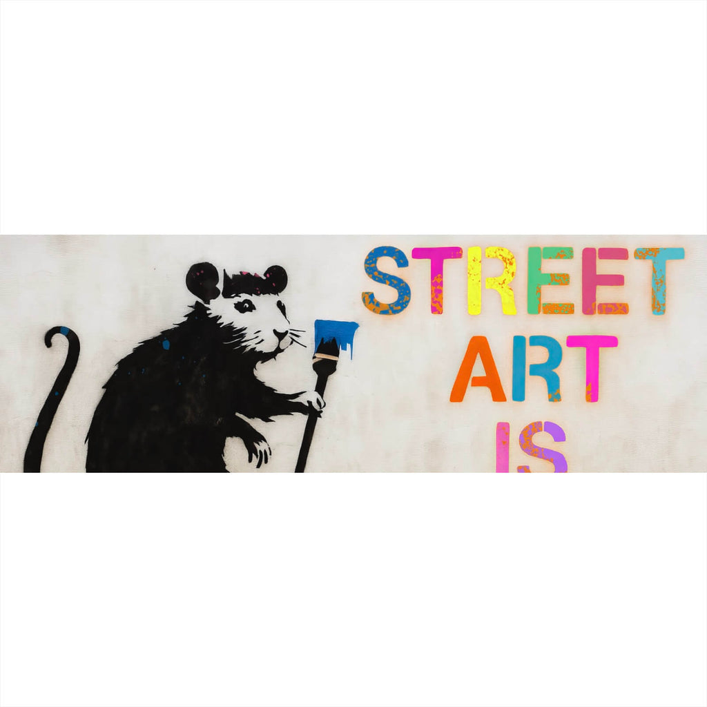Dieses beeindruckende Wandbild zeigt eine charakteristische Banksy-Ratte, die eine deutlich provokante Botschaft „Street Art is Dead!“ trägt. Die Ratte, ein wiederkehrendes Motiv in Banksys Werk, hält einen Pinsel und symbolisiert den rebellischen Charakter der Straßenkunst. Die Kombination aus Text und Bild schafft einen starken visuellen Kontrast und zieht sofort die Aufmerksamkeit auf sich. Das Werk vermittelt eine tiefgründige Aussage über die aktuelle Entwicklung der modernen Kunst und deren Wahrnehmung in der Gesellschaft. Die Formsprache ist klar und direkt, wobei die Ratte in einem dynamischen und lebendigen Stil dargestellt ist. Diese Komposition ist nicht nur ein Kunstwerk, sondern auch ein Statement, das zum Nachdenken anregt. Die Materialanmutung des Bildes gibt den Eindruck von urbanem Flair und roher Authentizität wieder, was es zu einer idealen Ergänzung für moderne Wohnräume oder kreative Büroumgebungen macht. Die Tiefe des Bildes wird durch die geschickte Platzierung der Elemente verstärkt, was eine intensive Raumwirkung erzeugt. Dieses Werk ist mehr als nur Dekoration; es ist ein Ausdruck von Zeitgeist und künstlerischer Freiheit.