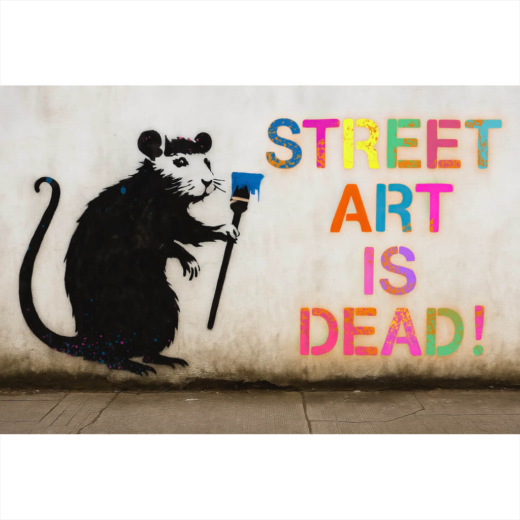 Dieses beeindruckende Wandbild zeigt eine charakteristische Banksy-Ratte, die eine deutlich provokante Botschaft „Street Art is Dead!“ trägt. Die Ratte, ein wiederkehrendes Motiv in Banksys Werk, hält einen Pinsel und symbolisiert den rebellischen Charakter der Straßenkunst. Die Kombination aus Text und Bild schafft einen starken visuellen Kontrast und zieht sofort die Aufmerksamkeit auf sich. Das Werk vermittelt eine tiefgründige Aussage über die aktuelle Entwicklung der modernen Kunst und deren Wahrnehmung in der Gesellschaft. Die Formsprache ist klar und direkt, wobei die Ratte in einem dynamischen und lebendigen Stil dargestellt ist. Diese Komposition ist nicht nur ein Kunstwerk, sondern auch ein Statement, das zum Nachdenken anregt. Die Materialanmutung des Bildes gibt den Eindruck von urbanem Flair und roher Authentizität wieder, was es zu einer idealen Ergänzung für moderne Wohnräume oder kreative Büroumgebungen macht. Die Tiefe des Bildes wird durch die geschickte Platzierung der Elemente verstärkt, was eine intensive Raumwirkung erzeugt. Dieses Werk ist mehr als nur Dekoration; es ist ein Ausdruck von Zeitgeist und künstlerischer Freiheit.