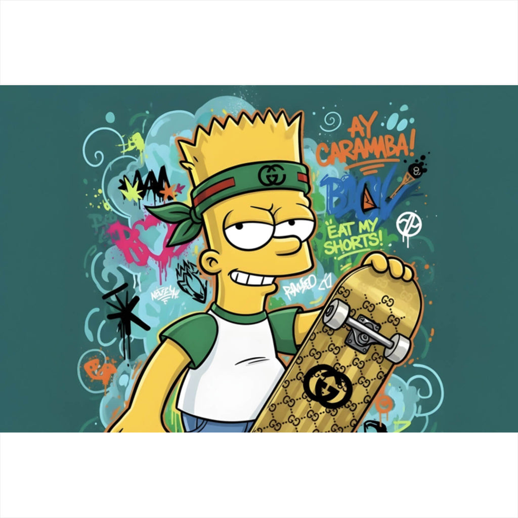 Dieses Wandbild zeigt ein auffälliges und lebendiges Cartoon-Motiv, das in einem modernen Graffiti-Stil gehalten ist. Im Zentrum steht eine ikonische Figur, die ein Skateboard lässig in der Hand hält, was dem Bild eine dynamische und jugendliche Ausstrahlung verleiht. Die umgebenden Graffiti-Elemente verstärken die urbane Atmosphäre und verleihen dem Raum, in dem dieses Bild präsentiert wird, einen Hauch von Rebellion und Kreativität. Die geschwungenen und kantigen Formen der Graffiti-Schriften ergänzen das zentrale Motiv perfekt und schaffen ein harmonisches und dennoch energiegeladenes Gesamtbild. Der Stil des Bildes ist eine moderne Interpretation von Pop Art und spiegelt aktuelle Trends wider, wodurch es sich ideal für kreative Räume wie Kinderzimmer oder Hobbyräume eignet. Die Tiefe und Textur des Designs verleihen dem Wandbild eine besondere Materialanmutung, die dem Raum eine lebendige und inspirierende Atmosphäre verleiht. Dieses Kunstwerk ist nicht nur ein Blickfang, sondern auch ein Ausdruck von Individualität und Stilbewusstsein, perfekt für alle, die ihre Umgebung mit einem zeitgemäßen und ausdrucksstarken Kunstwerk bereichern möchten.