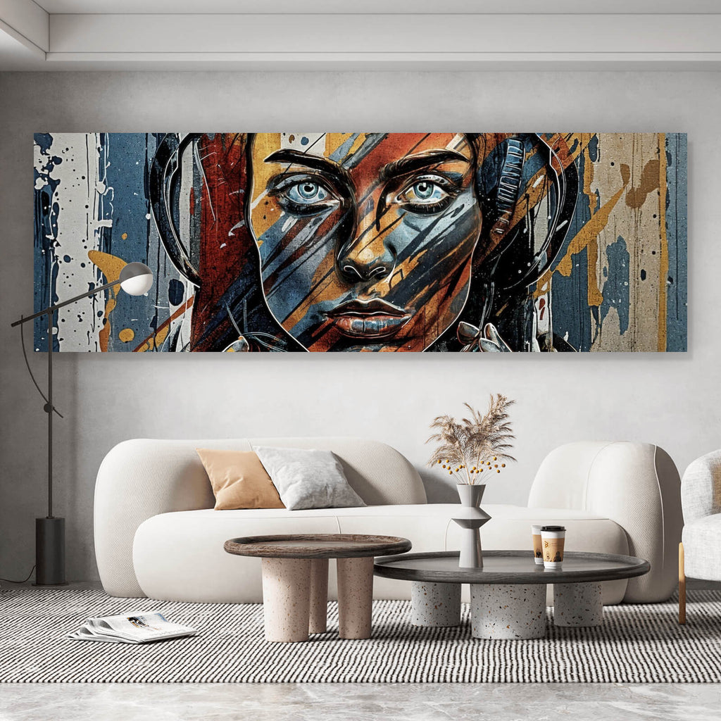 Dieses beeindruckende Wandbild vereint abstrakte Kunst mit einem modernen Porträtstil und zeigt das Gesicht einer Person, die Kopfhörer trägt. Die dynamische Komposition erzeugt durch die Kombination aus fließenden Linien und kräftigen Akzenten eine lebendige Ausstrahlung. Der Stil des Bildes ist inspiriert von Pop Art und moderner Kunst, wodurch es zu einem echten Blickfang wird. Die verschiedenen Elemente verschmelzen zu einem harmonischen Gesamteindruck, der sowohl Kreativität als auch Ausdrucksstärke vermittelt. Die Detailgenauigkeit im Gesicht und die spielerische Anordnung der Formen verleihen dem Bild eine besondere Tiefe und Dimension. Perfekt geeignet für das Wohnzimmer oder Büro, kann es jedem Raum einen modernen und stilvollen Akzent verleihen. Die Materialanmutung ist hochwertig und die kontrastreichen Formen sorgen für ein intensives visuelles Erlebnis, das die Persönlichkeit und den individuellen Stil unterstreicht. Dieses Wandbild ist nicht nur eine Dekoration, sondern auch ein Ausdruck von Innovation und Design, das sowohl Kunstliebhaber als auch moderne Interieur-Ästheten anspricht. Es bietet eine perfekte Gelegenheit, einen trendigen und gleichzeitig zeitlosen Look in Ihre Räumlichkeiten zu integrieren.