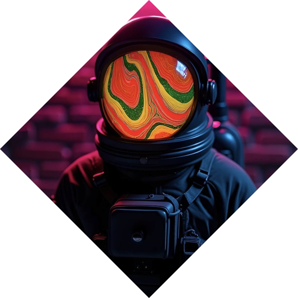 Das Bild zeigt einen Astronauten, der in einem futuristischen, dunklen Raum steht. Der Raum wird von einem leuchtenden Neonlicht in kräftigem Pink beleuchtet, das das Wort "BAKED" zeigt. Der Astronaut trägt einen klassischen Raumanzug, doch der Fokus liegt auf seinem Helm. Anstatt des gewohnten Spiegels ist die Helmfläche mit einem lebhaften, psychedelischen Muster bedeckt, das in kräftigen Farben wie Rot, Orange, Gelb und Grün leuchtet. Diese auffälligen Farben bilden einen starken Kontrast zu dem sonst dunklen, schwarzen Anzug des Astronauten. Der Hintergrund besteht aus einer strukturierten Ziegelmauer, die durch das Neonlicht ebenfalls in einem zarten Pink erstrahlt. Der Gesamteindruck des Bildes ist kreativ und futuristisch. Es kombiniert Elemente der Science-Fiction mit moderner Kunst und schafft dadurch ein einzigartiges visuelles Erlebnis. Diese Komposition spricht sowohl Liebhaber von Weltraummotiven als auch Fans von moderner Kunst an. Die farbenfrohe und abstrakte Gestaltung des Helms zieht sofort die Aufmerksamkeit auf sich und regt die Fantasie des Betrachters an. Das Bild eignet sich perfekt als inspirierender Hintergrund oder Dekorationselement für kreative Räume und Designs.