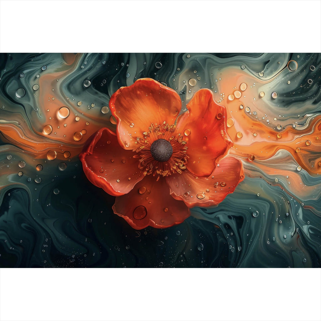 Dieses beeindruckende Wandbild im Fluid Art Stil zieht durch seine einzigartige Komposition und die Darstellung einer Blume alle Blicke auf sich. Die fließenden Formen und dynamischen Linien schaffen eine faszinierende Tiefe und verleihen dem Bild eine lebendige Bewegung, die es besonders ausdrucksstark macht. Die Anordnung der Elemente vermittelt ein Gefühl von Harmonie und Balance, perfekt für moderne Wohnräume. Die Bildoberfläche wirkt glatt und glänzend, was die lebendige Wirkung der Darstellung noch verstärkt. Ideal geeignet für Wohnzimmer, Schlafzimmer oder Büro, bringt dieses Kunstwerk eine stilvolle und inspirierende Atmosphäre in jeden Raum. Es ist nicht nur ein dekoratives Element, sondern auch ein Ausdruck kreativer Gestaltung und moderner Ästhetik. Die Kombination aus floralen Motiven und abstrakten Formen macht es zu einem vielseitigen Kunstwerk, das sowohl in klassischen als auch in modernen Einrichtungen hervorragend zur Geltung kommt. Die dynamische und zugleich beruhigende Ausstrahlung des Bildes schafft einen spannenden Kontrast, der sowohl die Kreativität als auch die Gelassenheit fördert, wodurch es zu einem perfekten Begleiter für jeden Raum wird.