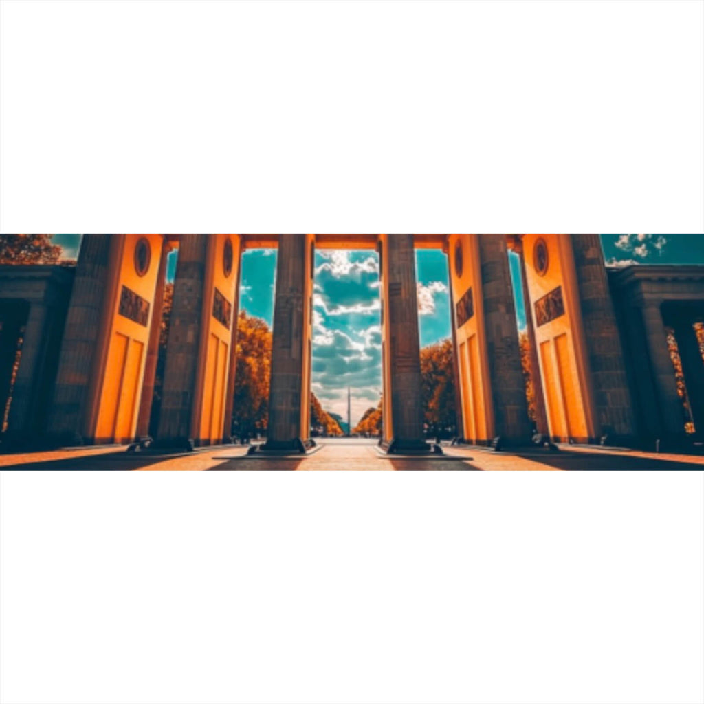 Das Bild zeigt ein beeindruckendes architektonisches Wahrzeichen, welches majestätisch im Sonnenlicht erstrahlt. Die eindrucksvolle Struktur ist perfekt symmetrisch und zieht den Betrachter mit ihrer imposanten Präsenz in den Bann. Die Sonnenstrahlen, die durch die Wolken brechen, erzeugen ein faszinierendes Spiel von Licht und Schatten, das die Tiefenwirkung des Motivs verstärkt. Die Perspektive des Bildes lenkt den Blick direkt auf das Herzstück des Bauwerks, wodurch eine epische und monumentale Stimmung entsteht. Die klare Linienführung und die präzise Gestaltung der architektonischen Details verleihen dem Bild eine zeitlose Eleganz. Diese Komposition ist ein perfektes Beispiel für die harmonische Verbindung von urbanem Design und natürlicher Beleuchtung. Es erweckt ein Gefühl von Geschichte und Kultur, das jeden Raum aufwertet, in dem es präsentiert wird. Die Aufnahme ist ideal für Liebhaber von Architektur und Design, die ein ikonisches Stück mit starker visueller Wirkung suchen. Dieses Kunstwerk ist nicht nur dekorativ, sondern auch inspirierend und fesselnd, perfekt geeignet, um in modernen und stilvollen Umgebungen ausgestellt zu werden.