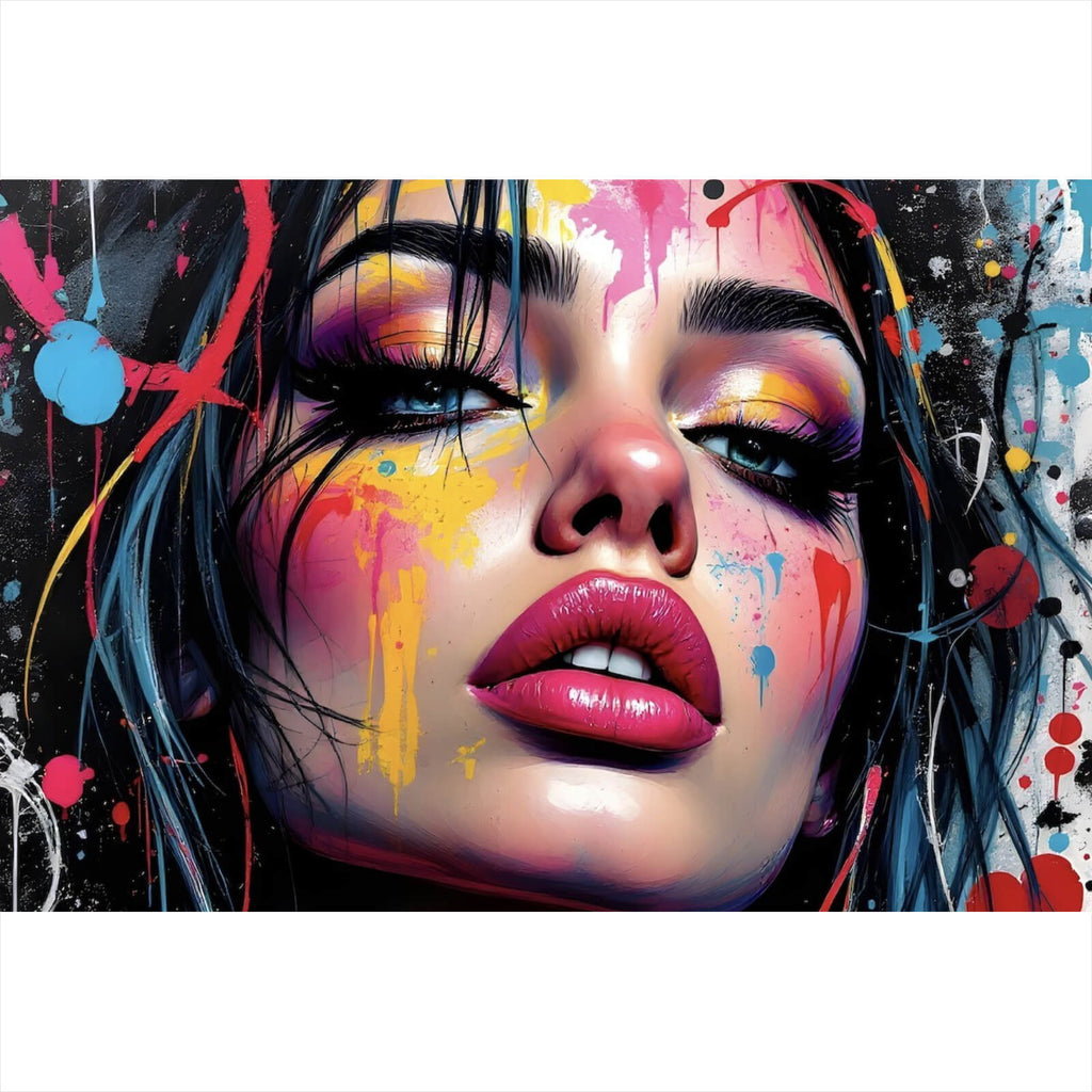 Dieses beeindruckende Kunstwerk ist ein ausdrucksstarkes Porträt im Pop Art Stil, das mit seiner lebendigen und dynamischen Darstellung die Aufmerksamkeit auf sich zieht. Das Motiv zeigt ein Gesicht, das durch die Kombination von abstrakten Elementen und präzise gesetzten Akzenten eine einzigartige Tiefe erhält. Die Komposition spielt mit verschiedenen Formen und Linien, die dem Bild eine moderne und kreative Anmutung verleihen. Die Darstellung ist sowohl detailreich als auch stilisiert, was die Individualität und Ausdruckskraft des Werkes unterstreicht. Durch die Verwendung von kräftigen Konturen und pointierten Details wird eine starke visuelle Wirkung erzielt, die in jedem Raum als zentraler Blickfang dient. Dieses Wandbild eignet sich hervorragend für moderne Wohnräume oder Büros, in denen es eine inspirierende Atmosphäre schafft. Die Ästhetik des Bildes kombiniert künstlerische Freiheit mit strukturiertem Design, wodurch es sowohl in minimalistischen als auch in lebendig gestalteten Umgebungen zur Geltung kommt. Ein perfektes Beispiel für zeitgenössische Kunst, die sowohl Stilbewusstsein als auch Originalität verkörpert.