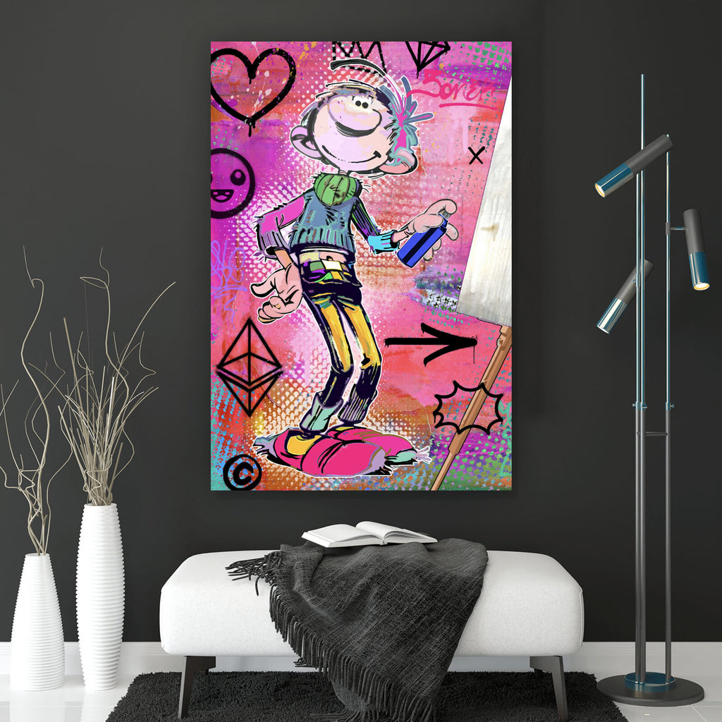 Das Bild zeigt eine lebendige und dynamische Szene in einem urbanen Kunststil. Im Zentrum steht eine Comic-ähnliche Figur, die fröhlich und bunt gekleidet ist. Die Figur hält eine Spraydose in der Hand, was auf eine Verbindung zur Graffiti- oder Street-Art-Kultur hinweist. Die Kleidung der Figur besteht aus einem grün-blauen Pullover und gelb-blauen Hosen, was den verspielten und kreativen Charakter unterstreicht. Links von der Figur ist eine Leinwand auf einem Holzständer zu sehen, auf der ein ikonisches Bild eines Mädchens mit einem Herzballon abgebildet ist. Dieses Bild erinnert an bekannte Street-Art-Werke und verleiht dem gesamten Werk eine tiefere Bedeutungsebene. Der Hintergrund ist eine Explosion aus Farben, vorwiegend Pink, Blau und Grün, mit verschiedenen grafischen Elementen wie Herzen, Pfeilen und geometrischen Formen, die das Bild zusätzlich beleben. Diese Elemente erzeugen eine dynamische und fesselnde Atmosphäre, die den Betrachter in eine Welt voller Kreativität und künstlerischer Freiheit eintauchen lässt. Der Stil des Bildes ist eine Mischung aus Pop-Art und Comic-Kunst, die mit modernen urbanen Elementen kombiniert wird, um ein einzigartiges visuelles Erlebnis zu schaffen.