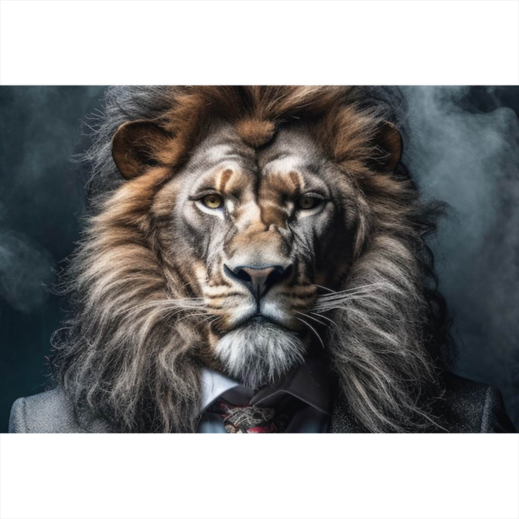 Dieses eindrucksvolle Wandbild zeigt ein majestätisches Löwenporträt, das sich durch seine edle und elegante Darstellung auszeichnet. Der Löwe trägt einen perfekt geschnittenen Anzug, der ihm eine außergewöhnliche Anmut und Autorität verleiht. Jedes Detail des Bildes ist sorgfältig ausgearbeitet, von der Struktur der Löwenmähne bis zu den filigranen Mustern auf der Krawatte. Die Kombination aus Tier und Mensch schafft eine faszinierende Hybridfigur, die sowohl Stärke als auch Intellekt symbolisiert. Die kunstvolle Inszenierung und der moderne Stil machen das Bild zu einem Highlight für jeden Raum, ob Büro oder Wohnzimmer. Es strahlt Charisma und eine starke Präsenz aus, die jeden Betrachter in ihren Bann zieht. Die kontrastreiche Komposition und die präzisen Details verleihen dem Wandbild eine beeindruckende Tiefe und lassen es fast dreidimensional wirken. Dieses Kunstwerk dient nicht nur als dekoratives Element, sondern auch als Gesprächsstoff, der die Betrachter dazu einlädt, über die symbolische Verbindung von Mensch und Tier nachzudenken. Es ist ideal für alle, die auf der Suche nach einer ausdrucksstarken und modernen Dekoration sind, die zugleich Stil und Persönlichkeit in einen Raum bringt.