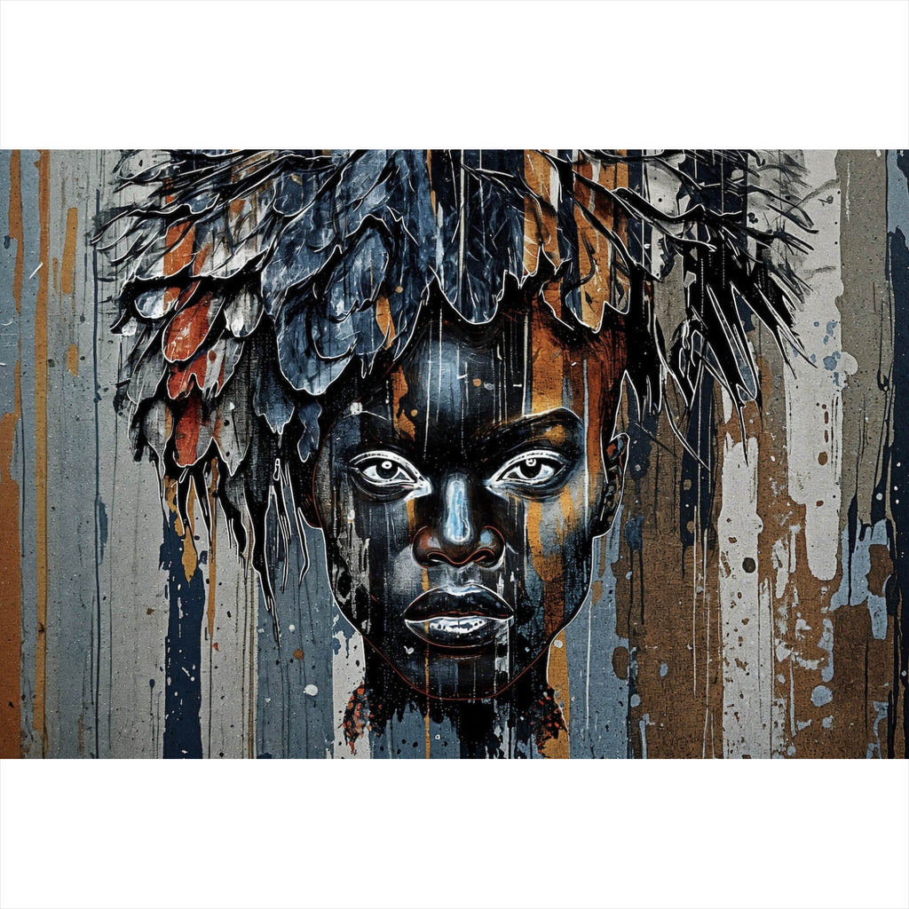 Dieses beeindruckende Wandbild zeigt ein abstraktes Gesicht, das mit einer Vielzahl von Federn verziert ist, die dem Kunstwerk eine dynamische und lebendige Anmutung verleihen. Die Federn sind in einem ausdrucksstarken Stil dargestellt, der sowohl Tiefe als auch Bewegung suggeriert. Das Gesicht selbst ist in einem grungigen Stil gehalten, was dem Bild einen modernen und urbanen Charakter verleiht. Die Kombination aus abstrakten Formen und realistischen Details schafft eine spannende visuelle Spannung, die den Betrachter in ihren Bann zieht. Das Bild eignet sich hervorragend für moderne Wohnräume und Büros und versprüht eine kreative und inspirierende Atmosphäre. Es ist ein Unikat, das sowohl Kunstliebhaber als auch Design-Enthusiasten anspricht und in jedem Raum als stilvolles Statement fungiert. Die kunstvolle Darstellung und die detailreiche Ausführung machen es zu einem Highlight jeder Wanddekoration. Mit seiner einzigartigen Kombination aus Abstraktion und Realismus spricht es die Sinne an und regt die Fantasie an. Dieses Kunstwerk ist mehr als nur Dekoration; es ist ein Ausdruck von Kreativität und Individualität, das jedem Raum eine besondere Note verleiht.