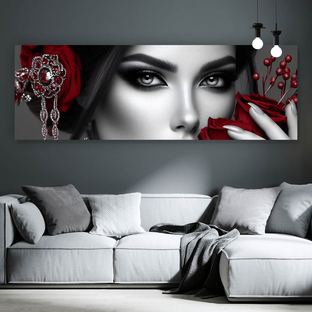 Auf der Suche nach einem ausgefallenen Wandbild als Poster? Das Motiv Elegante Frau mit Rosen und Schmuck No. 2 im Panorama gefällt dir und du hast nach Wandbildern mit den Wörtern Frau, Rosen, Porträt, Gesicht, Eleganz, Blüten, Stilvoll, Ausdruck, Glamour, Schönheit, Akzent, Luxus, Schmuck und Romantik gesucht? Dann ist dieses Poster in den Farben Schwarz-Weiß und Rot genau das richtige Wandbild und Dekorelement für dich! Setze ein Highlight an deiner Wand! Das Poster Elegante Frau mit Rosen und Schmuck No. 2 ist in 3 verschiedenen Größen verfügbar, von klein und dezent bis hin zum XXL Poster.