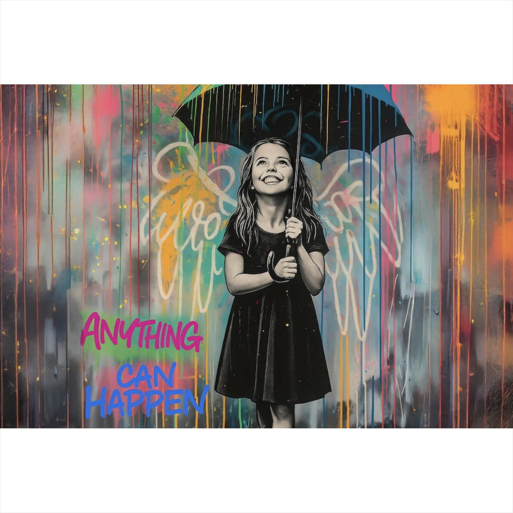 Das Bild zeigt ein fröhliches Mädchen, das unter einem bunten Regenschirm steht. Der Hintergrund ist ein beeindruckendes Farbenspiel aus leuchtenden Blau-, Orange- und Pinktönen, die herabfließen und an Regen erinnern. Die Farben vermischen sich zu einem lebendigen Kaleidoskop, das die gesamte Szenerie in eine traumhafte Atmosphäre taucht. Das Mädchen trägt ein schwarzes Kleid, das im Kontrast zu den lebendigen Farben steht und ihre freudige Ausstrahlung betont. Hinter dem Mädchen sind Engelsflügel skizziert, was dem Bild eine zusätzliche Dimension von Unschuld und Hoffnung verleiht. Ihre Augen sind nach oben gerichtet, und ihr Gesichtsausdruck strahlt Optimismus aus. Neben dem Mädchen sind die Worte „Anything can happen if you let it“ in einer dynamischen, bunten Schrift zu sehen, die die Botschaft von Positivität und Möglichkeiten unterstreicht. Dieses Kunstwerk kombiniert Elemente von Street Art und Pop Art, um eine inspirierende Botschaft zu vermitteln. Die Verwendung von kräftigen Farbspritzern und der Kontrast zwischen Schwarzweiß und leuchtenden Farben erzeugen eine auffällige visuelle Wirkung. Das Bild lädt den Betrachter ein, in eine Welt einzutauchen, in der Träume wahr werden können, wenn man es nur zulässt.