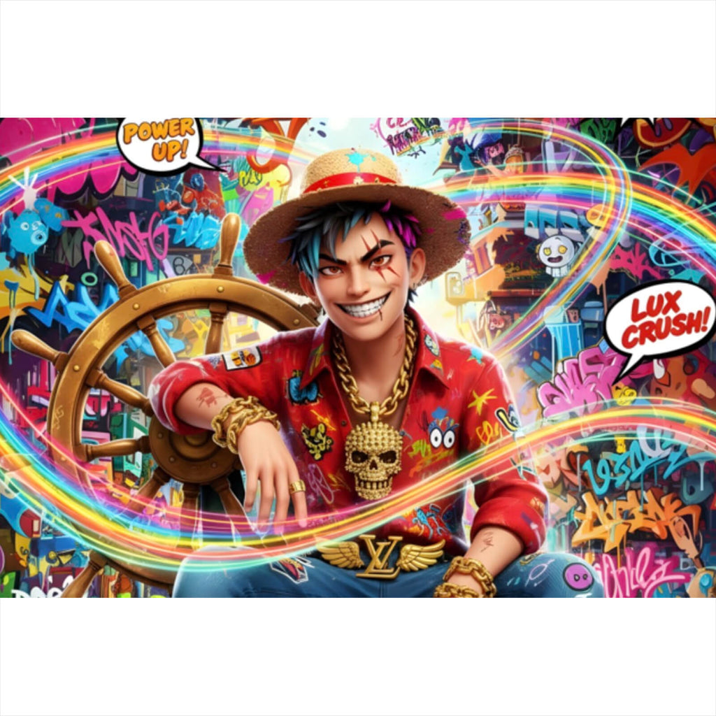 Dieses beeindruckende Wandbild vereint urbanes Graffiti mit lebendigen Cartoon-Elementen und schafft so eine dynamische und energiegeladene Atmosphäre. Im Vordergrund steht eine markante Figur mit einem ausdrucksstarken Gesichtsausdruck, die von einer Vielzahl an grafischen Elementen und stilisierten Schriftzügen umgeben ist. Die Komposition ist geprägt von einer Vielzahl an Details, die das Auge des Betrachters immer wieder auf neue Entdeckungen stoßen lassen. Der Hintergrund ist reich an texturierten Schichten und bietet eine Tiefe, die den Raum zum Leben erweckt. Moderne und traditionelle Kunststile verschmelzen hier zu einem einzigartigen visuellen Erlebnis, das sowohl Ausdruckskraft als auch Kreativität verkörpert. Die Szene strahlt eine jugendliche und rebellische Stimmung aus, die perfekt in moderne Wohn- und Arbeitsbereiche passt. Die Materialanmutung des Bildes vermittelt einen Hauch von Street Art, während die klaren Linien und Formen für eine moderne Ästhetik sorgen. Ideal für alle, die ihren Raum mit einem Hauch von Individualität und stilvollem Flair bereichern möchten.