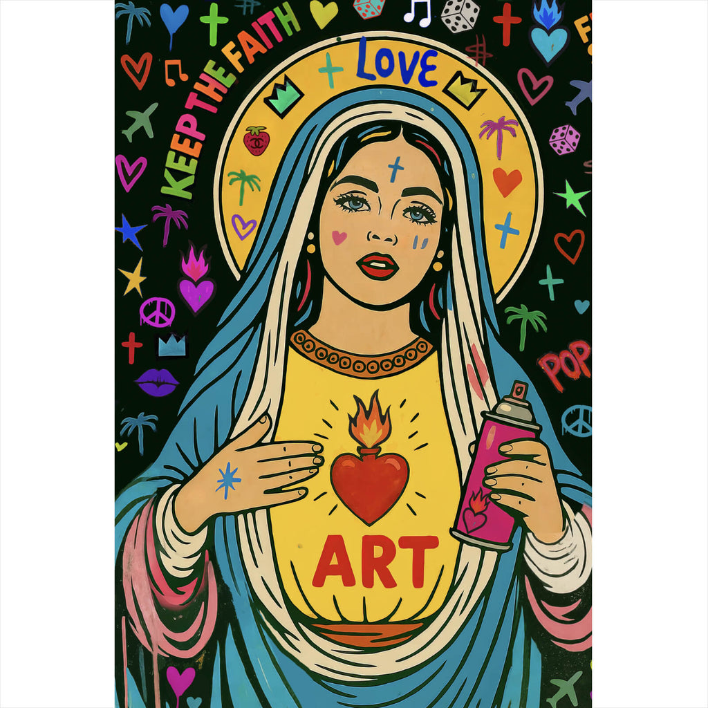 Das Bild zeigt eine moderne Darstellung der Heiligen Maria im Pop-Art- und Graffiti-Stil. Maria ist zentral im Bild positioniert, mit einem gelben Heiligenschein um ihren Kopf, der mit Symbolen wie Kreuzen und Kronen verziert ist. Sie trägt ein blaues Gewand mit weißen Akzenten, das an traditionelle Darstellungen erinnert. Auf ihrer Brust befindet sich ein rotes Herz mit Flammen, darüber das Wort "ART", was die Verbindung zwischen Spiritualität und Kunst symbolisiert. In ihrer rechten Hand hält sie eine pinke Spraydose, die auf den Einfluss der urbanen Street Art hinweist. Um sie herum sind zahlreiche bunte Symbole und Worte wie "KEEP THE FAITH", "LOVE", und "FREE SOUL" zu sehen. Diese Elemente verleihen dem Bild eine lebendige und moderne Atmosphäre, die traditionelle religiöse Ikonografie mit zeitgenössischer Kunst und jugendlicher Kultur verbindet. Die bunte Farbpalette und die Mischung aus verschiedenen Stilelementen machen das Bild zu einem ausdrucksstarken Kunstwerk, das sowohl spirituelle als auch kulturelle Themen anspricht.