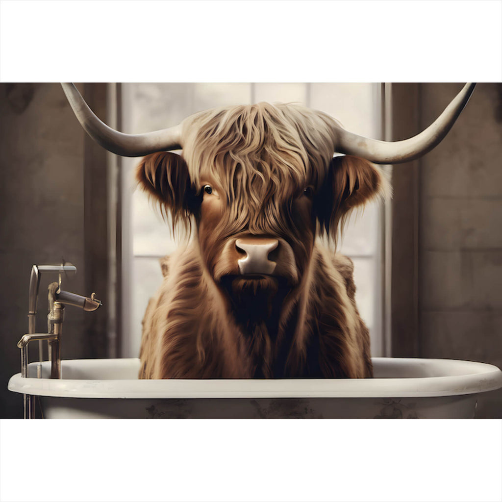 Auf der Suche nach einem ausgefallenen Wandbild als Poster? Das Motiv Hochlandrind in der Badewanne Vintage im Querformat gefällt dir und du hast nach Wandbildern mit den Wörtern Hochlandrind, Kuh, Highlander, Highlandcow, Rind, Schottland, Vintage, Tiere und Badewanne gesucht? Dann ist dieses Poster in den Farben Weiß, Beige und Braun genau das richtige Wandbild und Dekorelement für dich! Setze ein Highlight an deiner Wand! Das Poster Hochlandrind in der Badewanne Vintage ist in 4 verschiedenen Größen verfügbar, von klein und dezent bis hin zum XXL Poster.