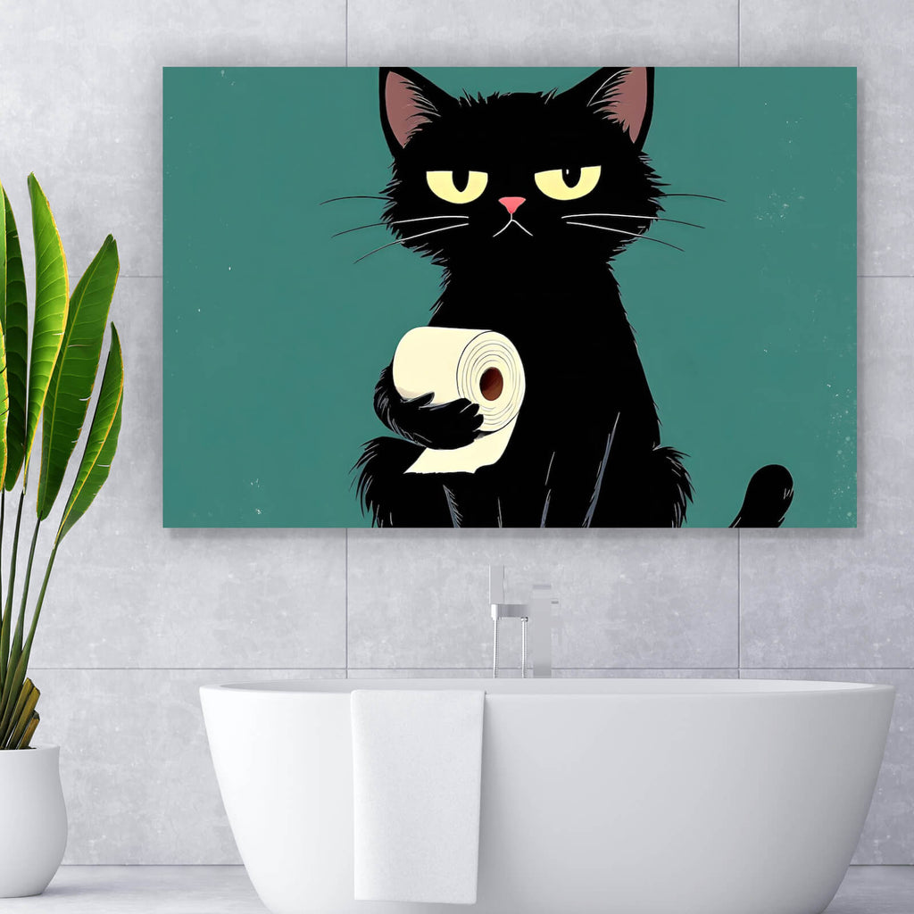 Diese humorvolle Wanddekoration zeigt eine stilisierte Katze, die mit einem sarkastischen Ausdruck eine Rolle Toilettenpapier hält. Das Motiv ist modern und witzig, perfekt, um jedem Raum eine charmante und unterhaltsame Note zu verleihen. Der Text auf dem Bild verstärkt den humorvollen Charakter und macht es zu einem echten Blickfang. Die klare Linienführung und der minimalistische Stil lassen es sowohl in modernen als auch in traditionellen Interieurs gut zur Geltung kommen. Besonders geeignet für Räume, in denen ein Schmunzeln willkommen ist, wie Badezimmer oder Büros, bringt dieses Bild eine spielerische Leichtigkeit mit sich. Es kann auch als originelles Geschenk für Katzenliebhaber oder Menschen mit einem Sinn für Humor dienen. Die Kombination aus Tiermotiv und witzigem Text trifft den Nerv der Zeit und macht es zu einer trendigen Ergänzung jeder Wand. Die Wirkung ist gleichermaßen beruhigend und erheiternd, was es zu einer idealen Wahl für alle macht, die ihrem Alltag eine Portion Humor hinzufügen möchten.
