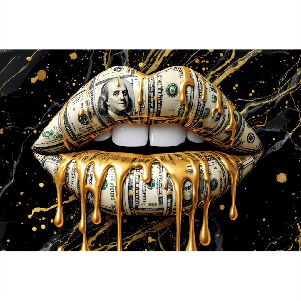 Dieses beeindruckende Wandbild zeigt ein faszinierendes Motiv, das Luxus und Kreativität in einem einzigartigen Kunstwerk vereint. Die zentrale Darstellung der Lippen, die aus Geldscheinen geformt sind, wird durch fließende goldene Akzente ergänzt, die dem Bild eine außergewöhnliche Tiefe und Dynamik verleihen. Die Kombination aus modernen und opulenten Elementen zieht den Betrachter in ihren Bann und vermittelt ein Gefühl von Glamour und Stil. Die kunstvoll arrangierten Details erzeugen eine eindrucksvolle Raumwirkung und machen das Bild zu einem echten Statement-Piece für jedes Interieur. Es eignet sich ideal für Räume, die nach einem Hauch von Exklusivität und Eleganz verlangen, und fügt sich nahtlos in moderne Wohn- und Arbeitsumgebungen ein. Die Verwendung von kontrastreichen Elementen verstärkt die visuelle Anziehungskraft und sorgt dafür, dass das Kunstwerk aus jedem Blickwinkel Aufmerksamkeit erregt. Die sorgfältige Gestaltung und die hochwertige Ausführung machen dieses Bild zu einem begehrten Dekorationsobjekt, das sowohl Kunstliebhaber als auch Design-Enthusiasten anspricht. Ob im Wohnzimmer, Büro oder in einer stilvollen Bar – dieses Wandbild setzt eindrucksvolle Akzente und unterstreicht ein anspruchsvolles Einrichtungsverständnis.