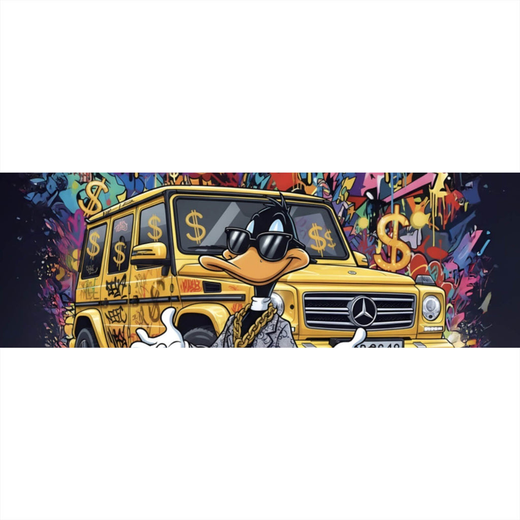 Dieses beeindruckende Wandbild vereint Elemente von Pop Art und modernem Stil, indem es eine ikonische Ente darstellt, die vor einem luxuriösen Auto posiert. Die Ente trägt auffällige Markenbekleidung und Accessoires, die sofort ins Auge springen und einen Hauch von Glamour und Luxus ausstrahlen. Umgeben von symbolträchtigen Logos und Geldscheinen erzeugt das Bild eine dynamische und lebendige Atmosphäre, die den Betrachter in eine Welt des Reichtums und der Opulenz entführt. Der Hintergrund ist mit Graffiti-Elementen und farbenfrohen Spritzern gestaltet, die der Szene Tiefe und Bewegung verleihen. Die Kombination aus bekannten Markensymbolen und urbanem Design macht dieses Bild zu einem echten Hingucker, der in jedem Raum ein modernes und trendiges Ambiente schafft. Die Darstellung spielt mit Humor und Extravaganz und ist ideal für Räume, die einen kreativen und modischen Akzent benötigen. Die Materialanmutung ist hochwertig und vermittelt eine hochwertige und edle Ausstrahlung. Dieses Kunstwerk ist perfekt für alle, die ein starkes Statement setzen möchten und ihren Raum mit einem einzigartigen und stilvollen Kunstwerk bereichern wollen.