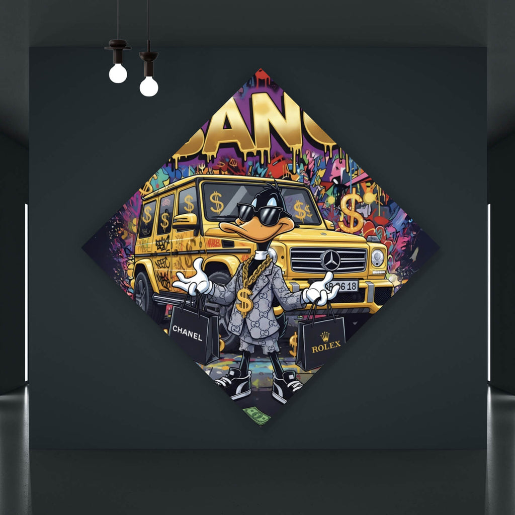 Dieses beeindruckende Wandbild vereint Elemente von Pop Art und modernem Stil, indem es eine ikonische Ente darstellt, die vor einem luxuriösen Auto posiert. Die Ente trägt auffällige Markenbekleidung und Accessoires, die sofort ins Auge springen und einen Hauch von Glamour und Luxus ausstrahlen. Umgeben von symbolträchtigen Logos und Geldscheinen erzeugt das Bild eine dynamische und lebendige Atmosphäre, die den Betrachter in eine Welt des Reichtums und der Opulenz entführt. Der Hintergrund ist mit Graffiti-Elementen und farbenfrohen Spritzern gestaltet, die der Szene Tiefe und Bewegung verleihen. Die Kombination aus bekannten Markensymbolen und urbanem Design macht dieses Bild zu einem echten Hingucker, der in jedem Raum ein modernes und trendiges Ambiente schafft. Die Darstellung spielt mit Humor und Extravaganz und ist ideal für Räume, die einen kreativen und modischen Akzent benötigen. Die Materialanmutung ist hochwertig und vermittelt eine hochwertige und edle Ausstrahlung. Dieses Kunstwerk ist perfekt für alle, die ein starkes Statement setzen möchten und ihren Raum mit einem einzigartigen und stilvollen Kunstwerk bereichern wollen.