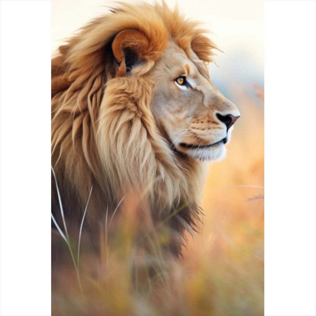 Dieses beeindruckende Wandbild zeigt einen majestätischen Löwen, der in seiner natürlichen Umgebung verweilt. Der Löwe ist in einer ruhigen und dennoch kraftvollen Pose dargestellt, die seine Stärke und Anmut hervorhebt. Seine Mähne ist detailliert und voluminös, was ihm eine königliche Erscheinung verleiht. Das Bild fängt die Essenz der Wildnis ein und vermittelt ein Gefühl von Freiheit und Abenteuer. Der Hintergrund zeigt eine sanfte, verschwommene Landschaft, die den Fokus auf den Löwen verstärkt und ihm eine zentrale Rolle verleiht. Die Komposition des Bildes ist harmonisch und ausgewogen, was es zu einem idealen Kunstwerk für verschiedene Räume macht. Es zieht den Betrachter in die Welt der Savanne und bietet eine visuelle Flucht in die unberührte Natur. Dieses Bild eignet sich perfekt als Dekoration für Wohnzimmer, Büros oder Schlafzimmer und bringt ein Stück der wilden Schönheit Afrikas in den Raum. Die detaillierte Darstellung und der künstlerische Stil machen es zu einem zeitlosen Kunstwerk, das sowohl Modernität als auch klassische Eleganz ausstrahlt.