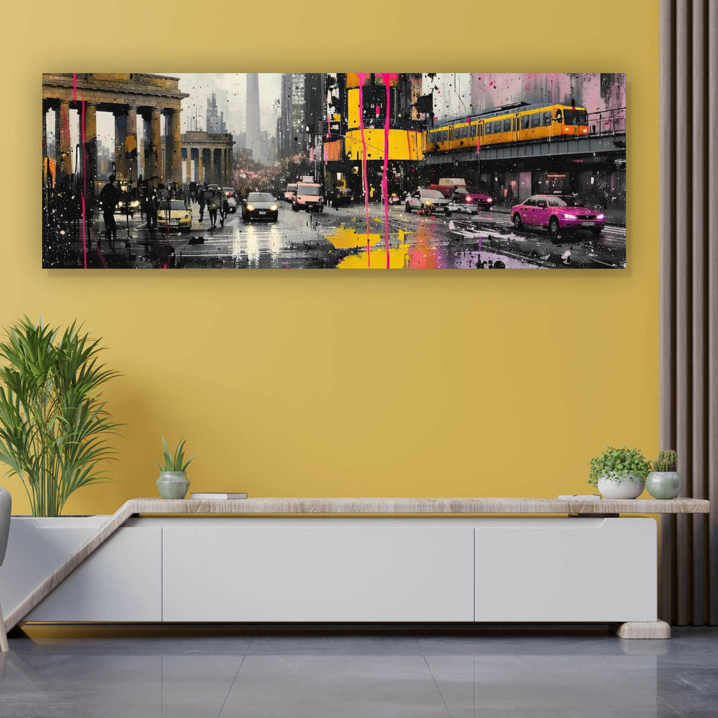 Dieses eindrucksvolle Wandbild zeigt ein modernes Stadtbild, das durch seine dynamische und lebendige Darstellung besticht. Im Vordergrund sind die Silhouetten von Gebäuden und eine belebte Straßenszene zu sehen, die das pulsierende Leben einer Metropole einfangen. Die Komposition wird durch prägnante Formen und eine künstlerische Anordnung von Elementen geprägt, die den Betrachter in eine urbane Szenerie voller Energie und Bewegung versetzen. Die Darstellung der Skyline und der Verkehrsszene vermittelt ein Gefühl von unaufhörlicher Aktivität und moderner Lebensart. Der Stil des Bildes kombiniert Elemente der Pop Art und Modern Art, was ihm eine kreative und inspirierende Wirkung verleiht. Durch die geschickte Nutzung von Kontrasten und Formen entsteht eine spannende Tiefe, die dem Raum eine besondere Atmosphäre verleiht. Dieses Wandbild eignet sich hervorragend als dekoratives Element für Wohnzimmer, Büros oder gastronomische Einrichtungen und kann als inspirierender Blickfang dienen, der Gespräche anregt und die Kreativität fördert. Die künstlerische Darstellung der urbanen Umgebung verleiht dem Bild eine einzigartige Materialanmutung, die sowohl modern als auch zeitlos wirkt, und es zu einem idealen Kunstwerk für verschiedene Raumkonzepte macht.