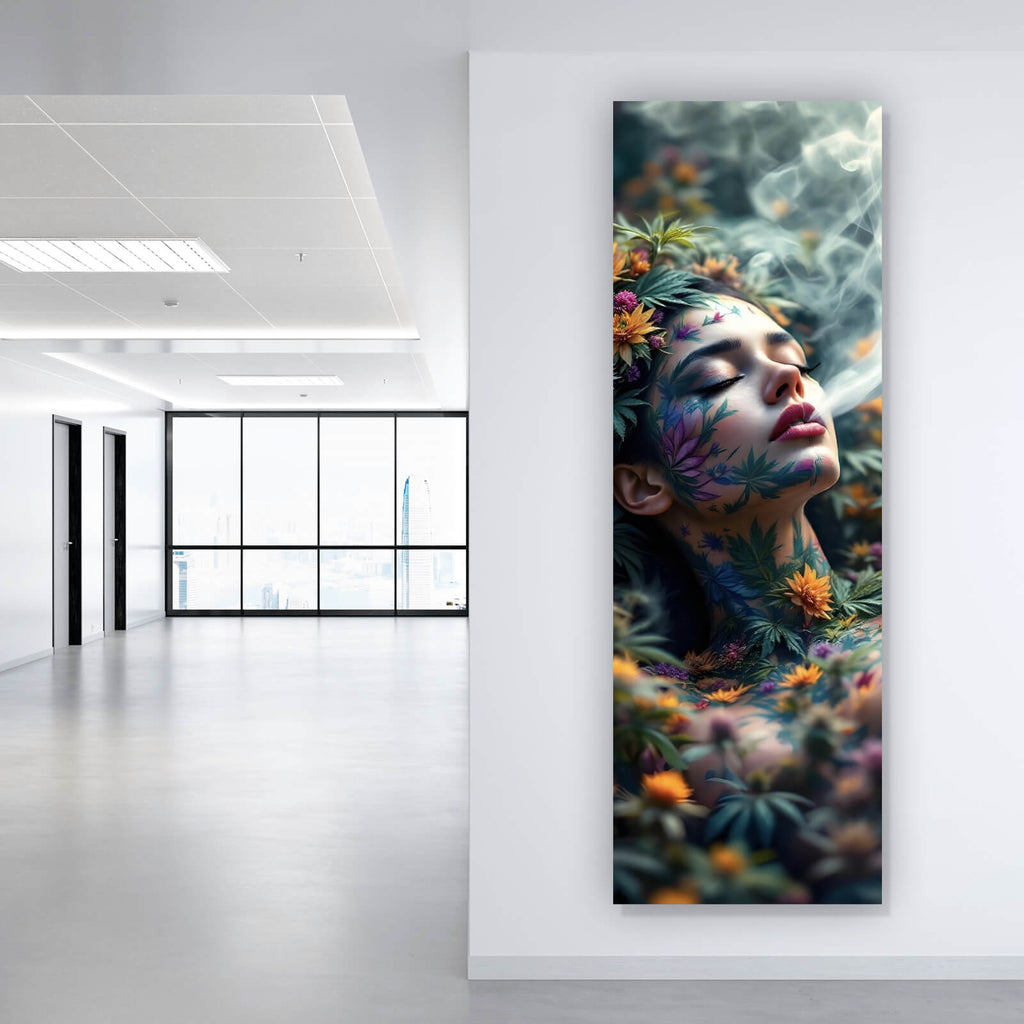 Auf der Suche nach einem ausgefallenen Wandbild als Poster? Das Motiv Mystische rauchende Frau mit Blüten im Panorama Hoch gefällt dir und du hast nach Wandbildern mit den Wörtern Cannabis, Frau, Mystik, Blüten, Blumen, Rauch, Gesicht, Natur, Entspannung, Meditation, Modern, Harmonie, Schönheit und Surrealismus gesucht? Dann ist dieses Poster in der Farbe Bunt genau das richtige Wandbild und Dekorelement für dich! Setze ein Highlight an deiner Wand! Das Poster Mystische rauchende Frau mit Blüten ist in 3 verschiedenen Größen verfügbar, von klein und dezent bis hin zum XXL Poster.