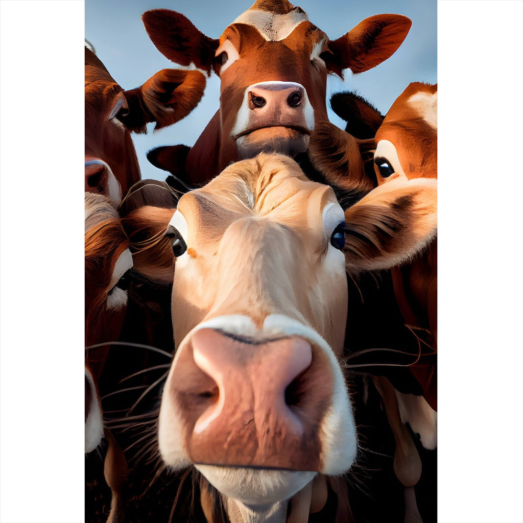 Das Bild zeigt eine eindrucksvolle Nahaufnahme von neugierigen Kühen, die die Betrachter direkt anzuschauen scheinen. Diese Darstellung von Tieren in ihrer natürlichen Umgebung vermittelt ein Gefühl von Ruhe und Gelassenheit und ist ideal für Liebhaber von Naturmotiven. Die Kühe sind detailreich abgebildet und strahlen eine rustikale und gemütliche Atmosphäre aus, die perfekt in ein modernes oder ländlich inspiriertes Interieur passt. Die Komposition der Köpfe und Schnauzen, die fast den gesamten Bildraum einnehmen, zieht die Aufmerksamkeit auf sich und schafft eine tiefe Verbindung zwischen Bild und Betrachter. Die harmonische Anordnung der Tiere und der klare Fokus auf ihre Gesichtszüge verleihen dem Bild eine lebendige und zugleich beruhigende Wirkung. Diese Wanddekoration eignet sich hervorragend für Wohnräume, die eine entspannende und einladende Atmosphäre ausstrahlen sollen, sei es im Wohnzimmer, Esszimmer oder Büro. Die Bildwirkung ist kraftvoll und doch subtil, was es zu einer vielseitigen Ergänzung für verschiedene Raumkonzepte macht. Die präzise Detailarbeit und die natürliche Anmutung des Motivs machen dieses Wandbild zu einem idealen Accessoire für Liebhaber von Tierfotografie und modernem Design.