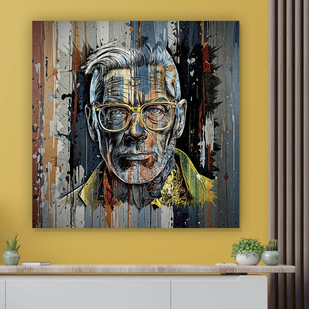 Das beeindruckende Wandbild zeigt ein modernes Portrait, das durch seine einzigartige Spritztechnik eine besondere Dynamik und Ausdruckskraft erhält. Die Kombination aus abstrakten Elementen und präzisen Konturen verleiht dem Werk eine faszinierende Tiefe und zieht den Betrachter in seinen Bann. Die dargestellte Person, mit markanten Gesichtszügen und stilvoller Brille, vermittelt eine starke Präsenz und lässt Raum für Interpretationen. Die verschiedenen Ebenen des Bildes, erzeugt durch die geschickte Anwendung der Spritztechnik, schaffen eine lebendige Struktur, die sowohl in modernen Wohnräumen als auch in kreativen Arbeitsumgebungen eine inspirierende Atmosphäre schafft. Die Mischung aus urbanem Grunge und klassischer Portraitkunst macht dieses Werk zu einem Highlight für Kunstliebhaber und Dekorationsbegeisterte. Es eignet sich perfekt, um in Wohnzimmern, Büros oder Praxen Akzente zu setzen und eine stilvolle, trendige Umgebung zu schaffen. Die künstlerische Raffinesse und der innovative Stil des Bildes garantieren, dass es sowohl als dekoratives Element als auch als Gesprächsanlass dient.