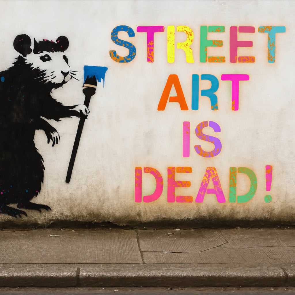 Dieses beeindruckende Wandbild zeigt eine charakteristische Banksy-Ratte, die eine deutlich provokante Botschaft „Street Art is Dead!“ trägt. Die Ratte, ein wiederkehrendes Motiv in Banksys Werk, hält einen Pinsel und symbolisiert den rebellischen Charakter der Straßenkunst. Die Kombination aus Text und Bild schafft einen starken visuellen Kontrast und zieht sofort die Aufmerksamkeit auf sich. Das Werk vermittelt eine tiefgründige Aussage über die aktuelle Entwicklung der modernen Kunst und deren Wahrnehmung in der Gesellschaft. Die Formsprache ist klar und direkt, wobei die Ratte in einem dynamischen und lebendigen Stil dargestellt ist. Diese Komposition ist nicht nur ein Kunstwerk, sondern auch ein Statement, das zum Nachdenken anregt. Die Materialanmutung des Bildes gibt den Eindruck von urbanem Flair und roher Authentizität wieder, was es zu einer idealen Ergänzung für moderne Wohnräume oder kreative Büroumgebungen macht. Die Tiefe des Bildes wird durch die geschickte Platzierung der Elemente verstärkt, was eine intensive Raumwirkung erzeugt. Dieses Werk ist mehr als nur Dekoration; es ist ein Ausdruck von Zeitgeist und künstlerischer Freiheit.