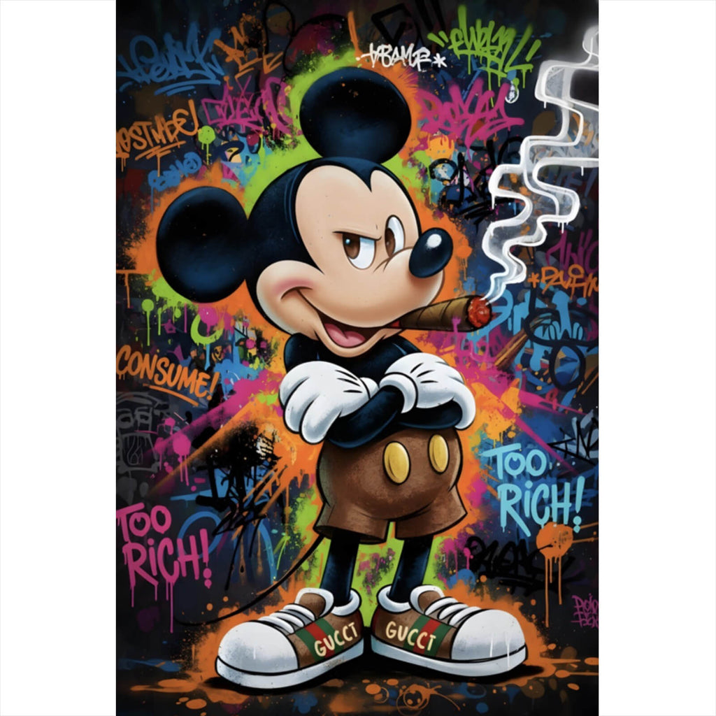Dieses Wandbild zeigt einen ikonischen Charakter im modernen Graffiti-Stil, der sich perfekt als auffälliges Statement-Piece eignet. Der Charakter steht im Mittelpunkt des Bildes und ist von lebhaften, dynamischen Graffiti-Elementen umgeben, die das Bild zu einem echten Hingucker machen. Durch den urbanen Pop-Art-Stil wirkt das Bild sowohl zeitgenössisch als auch kunstvoll, was es ideal für moderne Räume macht. Die Mischung aus abstrakten Formen und klaren Linien verleiht ihm eine besondere Tiefe und Struktur, die das Bild lebendig erscheinen lässt. Die Materialanmutung ist hochwertig, was dem Bild eine exklusive und stilvolle Ausstrahlung verleiht. Es eignet sich hervorragend für Räume, die eine kreative und trendige Atmosphäre ausstrahlen sollen, wie Wohnzimmer, Bars oder Büros. Dieses Kunstwerk ist nicht nur dekorativ, sondern auch ein Ausdruck von Individualität und modernem Lebensstil. Die Kombination aus Grunge-Elementen und Pop-Art macht es zu einem vielseitigen Kunstwerk, das in verschiedenen Einrichtungskonzepten integriert werden kann. Das Bild hat eine starke Präsenz und zieht die Aufmerksamkeit auf sich, wodurch es zu einem zentralen Punkt in jedem Raum wird. Es ist ein Muss für Kunstliebhaber, die nach etwas Besonderem und Einzigartigem suchen, um ihre Wanddekoration auf ein neues Niveau zu heben.
