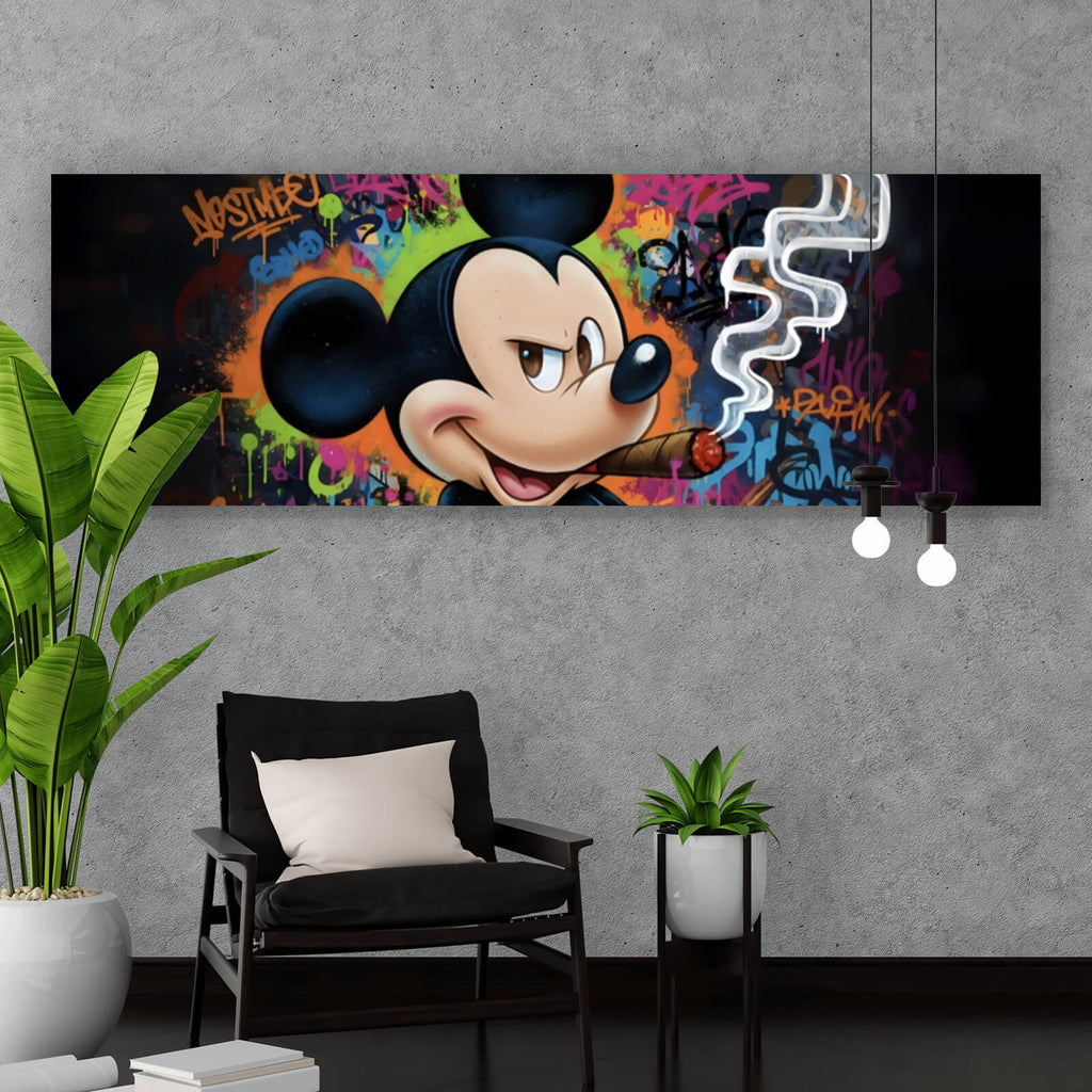 Dieses Wandbild zeigt einen ikonischen Charakter im modernen Graffiti-Stil, der sich perfekt als auffälliges Statement-Piece eignet. Der Charakter steht im Mittelpunkt des Bildes und ist von lebhaften, dynamischen Graffiti-Elementen umgeben, die das Bild zu einem echten Hingucker machen. Durch den urbanen Pop-Art-Stil wirkt das Bild sowohl zeitgenössisch als auch kunstvoll, was es ideal für moderne Räume macht. Die Mischung aus abstrakten Formen und klaren Linien verleiht ihm eine besondere Tiefe und Struktur, die das Bild lebendig erscheinen lässt. Die Materialanmutung ist hochwertig, was dem Bild eine exklusive und stilvolle Ausstrahlung verleiht. Es eignet sich hervorragend für Räume, die eine kreative und trendige Atmosphäre ausstrahlen sollen, wie Wohnzimmer, Bars oder Büros. Dieses Kunstwerk ist nicht nur dekorativ, sondern auch ein Ausdruck von Individualität und modernem Lebensstil. Die Kombination aus Grunge-Elementen und Pop-Art macht es zu einem vielseitigen Kunstwerk, das in verschiedenen Einrichtungskonzepten integriert werden kann. Das Bild hat eine starke Präsenz und zieht die Aufmerksamkeit auf sich, wodurch es zu einem zentralen Punkt in jedem Raum wird. Es ist ein Muss für Kunstliebhaber, die nach etwas Besonderem und Einzigartigem suchen, um ihre Wanddekoration auf ein neues Niveau zu heben.
