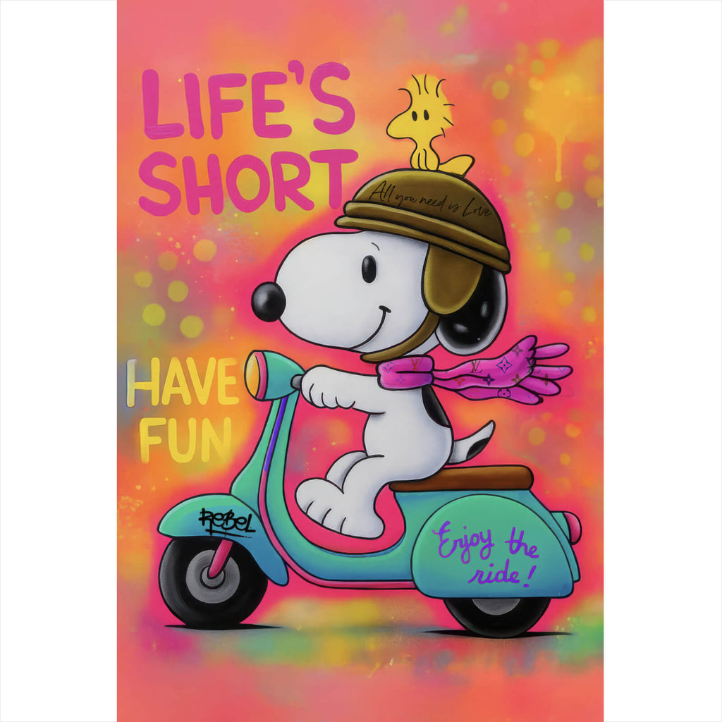 Das Bild zeigt eine fröhliche und bunte Illustration eines beliebten Cartoon-Hundes, der auf einem türkisfarbenen Roller sitzt. Der Hintergrund ist in lebhaften Pink- und Gelbtönen gehalten, die dem Bild eine energetische und fröhliche Ausstrahlung verleihen. Der Hund trägt einen braunen Helm, auf dem der Schriftzug "All you need is Love" zu sehen ist, und um seinen Hals flattert ein rosa Schal. Auf dem Roller sind die Worte "Enjoy the ride!" geschrieben, was die Botschaft des Bildes unterstreicht, nämlich das Leben zu genießen. Über dem Hund schwebt ein kleiner gelber Vogel, der ebenfalls aus der Cartoon-Welt bekannt ist. Der Hintergrund ist mit bunten Tupfen und Spritzern verziert, die dem Bild eine dynamische, graffitiartige Textur verleihen. Die Worte "Life's Short" und "Have Fun" sind in kräftigen Buchstaben im Hintergrund zu sehen und verstärken die lebensbejahende Botschaft des Kunstwerks. Dieses Bild ist eine Hommage an Freiheit, Abenteuer und die Freude am Leben, dargestellt in einem lebendigen und einladenden Stil.