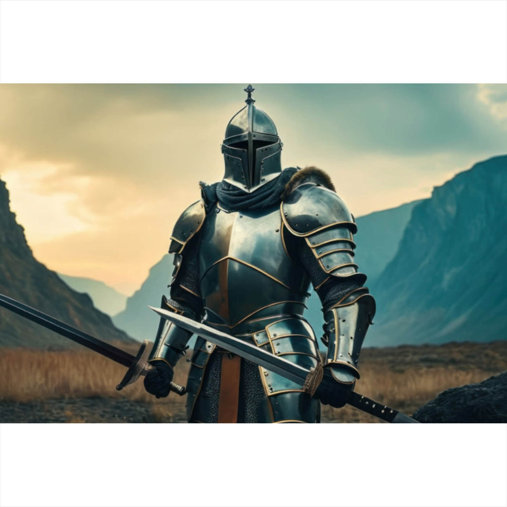 Ein beeindruckendes Wandbild zeigt einen majestätischen Ritter, der in voller Rüstung in einer weiten, natürlichen Landschaft steht. Der Krieger hält zwei Schwerter, die seine Tapferkeit und Kampfbereitschaft symbolisieren. Die Szene zieht den Betrachter in eine epische Welt, in der mittelalterliche Helden und mythische Abenteuer lebendig werden. Die Rüstung glänzt im Licht und verleiht dem Ritter eine eindrucksvolle Präsenz, die sowohl Stärke als auch Respekt ausstrahlt. Die umgebende Landschaft verstärkt die epische Aura des Bildes und bietet Tiefe, die den Raum erweitert und eine mystische Atmosphäre schafft. Der Stil des Bildes vereint historische und moderne Elemente, was es zu einem faszinierenden Blickfang in jedem Raum macht. Ideal für diejenigen, die eine Vorliebe für Mythologie und Geschichte haben, bringt dieses Kunstwerk eine spirituelle und inspirierende Note in jede Umgebung. Es ist perfekt geeignet für Büros, Wohnzimmer oder Hobbyräume und spricht all jene an, die den Geist von Abenteuer und Tradition schätzen.