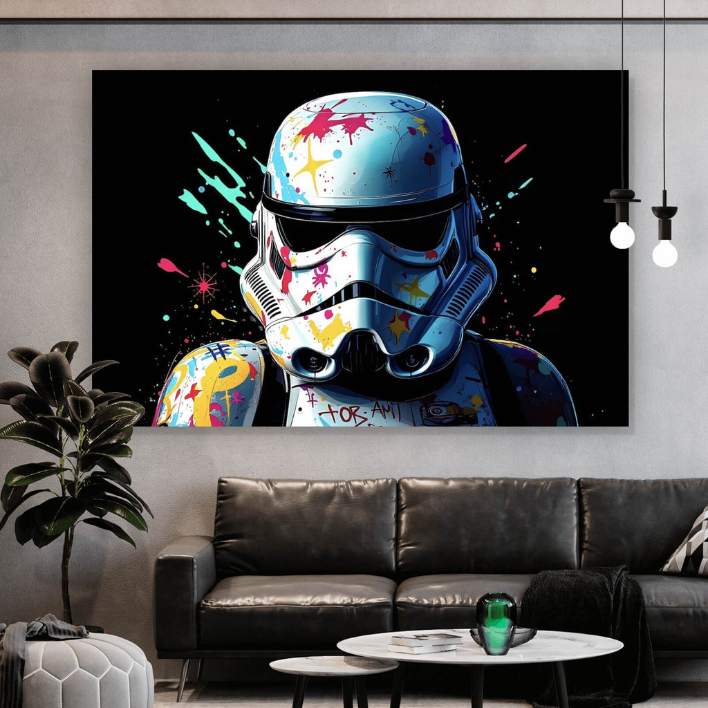 Dieses beeindruckende Wandbild zeigt ein modernes Stormtrooper-Motiv, das durch kreative Pop-Art-Elemente und dynamische Graffiti-Akzente hervorsticht. Es kombiniert die ikonische Figur des Stormtroopers mit einem urbanen und zeitgenössischen Kunststil, der sowohl Ausdrucksstärke als auch Kreativität verkörpert. Die Kombination aus Graffiti und Pop-Art verleiht dem Bild eine lebendige und energiegeladene Atmosphäre, die in jedem Raum zum Blickfang wird. Die Details auf dem Helm und der Rüstung des Stormtroopers sind kunstvoll gestaltet, wodurch das Bild eine faszinierende Tiefe und Dimension erhält. Diese einzigartige Darstellung eignet sich hervorragend für moderne Wohnräume, Büros oder Bars, die einen Hauch von Popkultur und künstlerischer Raffinesse suchen. Das Bild strahlt eine Mischung aus Nostalgie und Avantgarde aus und wird sicherlich Gesprächsstoff bieten. Es ist nicht nur ein Kunstwerk, sondern auch eine Hommage an die Welt der Filme und Popkultur, ideal für Sammler und Liebhaber moderner Kunst.