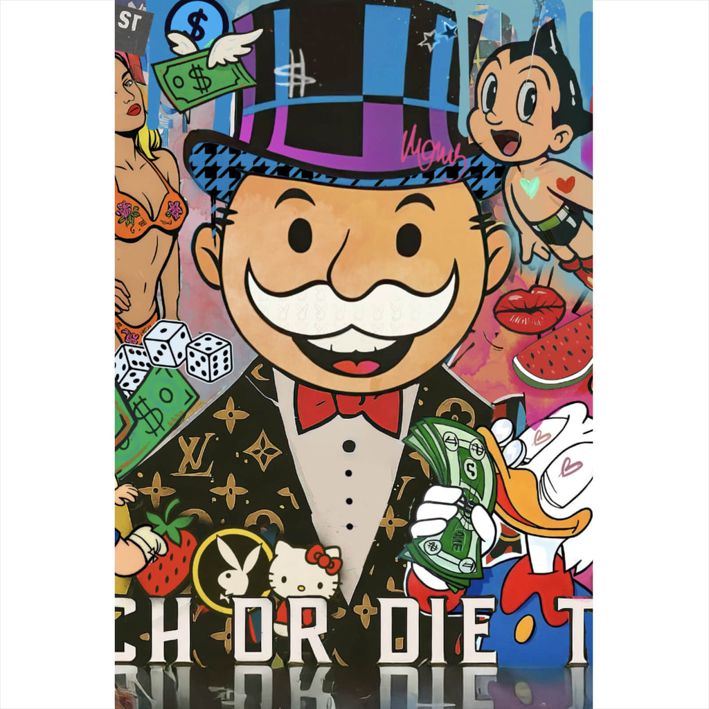 Das Bild zeigt eine bunte Pop-Art-Collage voller ikonischer Comic- und Zeichentrickfiguren, die um ein zentrales Monopoly-Maskottchen herum arrangiert sind. Dieses trägt einen Zylinder und lächelt fröhlich, während es von verschiedenen symbolischen Elementen umgeben wird, die Reichtum und Kapitalismus darstellen. Fliegende Geldscheine mit Flügeln schweben durch das Bild, während Würfel und Dollarzeichen die Glücksspielelemente unterstreichen. Bekannte Figuren wie die von klassischen Cartoons und Comics fügen sich in die bunte Szene ein, darunter ein fliegender Junge mit Raketenstiefeln und eine Frau im roten Kleid. Im Hintergrund sind weitere popkulturelle Referenzen zu erkennen, die das Bild mit einem Hauch von Nostalgie versehen. Unten im Bild verläuft der provokante Schriftzug "GET RICH OR DIE TRYING", der den kapitalistischen Unterton der Collage verstärkt. Die leuchtenden Farben Blau, Rot und Grün dominieren das Bild und verleihen ihm eine lebendige, energiegeladene Atmosphäre. Diese Collage bringt humorvoll die Themen Reichtum, Konsum und Popkultur zusammen und lädt den Betrachter ein, über die Symbole und ihre Bedeutung nachzudenken.