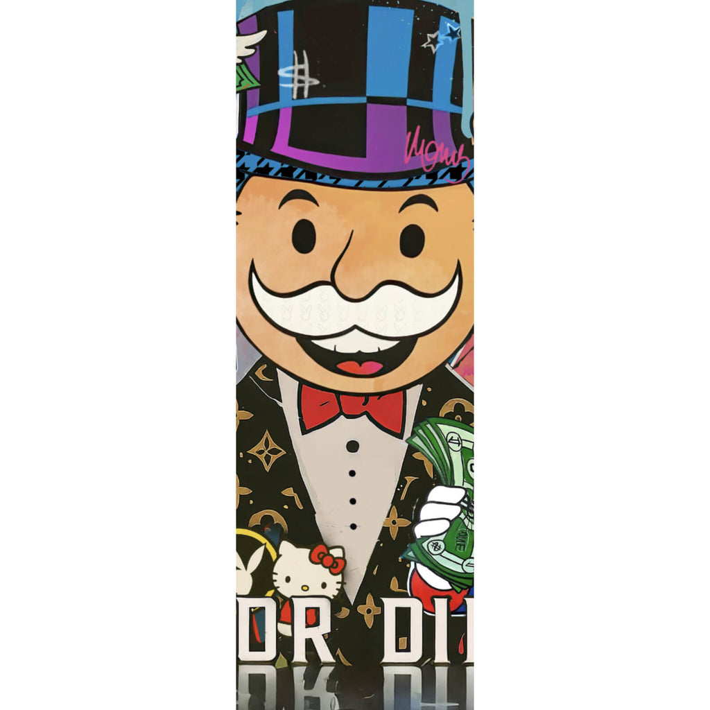 Das Bild zeigt eine bunte Pop-Art-Collage voller ikonischer Comic- und Zeichentrickfiguren, die um ein zentrales Monopoly-Maskottchen herum arrangiert sind. Dieses trägt einen Zylinder und lächelt fröhlich, während es von verschiedenen symbolischen Elementen umgeben wird, die Reichtum und Kapitalismus darstellen. Fliegende Geldscheine mit Flügeln schweben durch das Bild, während Würfel und Dollarzeichen die Glücksspielelemente unterstreichen. Bekannte Figuren wie die von klassischen Cartoons und Comics fügen sich in die bunte Szene ein, darunter ein fliegender Junge mit Raketenstiefeln und eine Frau im roten Kleid. Im Hintergrund sind weitere popkulturelle Referenzen zu erkennen, die das Bild mit einem Hauch von Nostalgie versehen. Unten im Bild verläuft der provokante Schriftzug "GET RICH OR DIE TRYING", der den kapitalistischen Unterton der Collage verstärkt. Die leuchtenden Farben Blau, Rot und Grün dominieren das Bild und verleihen ihm eine lebendige, energiegeladene Atmosphäre. Diese Collage bringt humorvoll die Themen Reichtum, Konsum und Popkultur zusammen und lädt den Betrachter ein, über die Symbole und ihre Bedeutung nachzudenken.