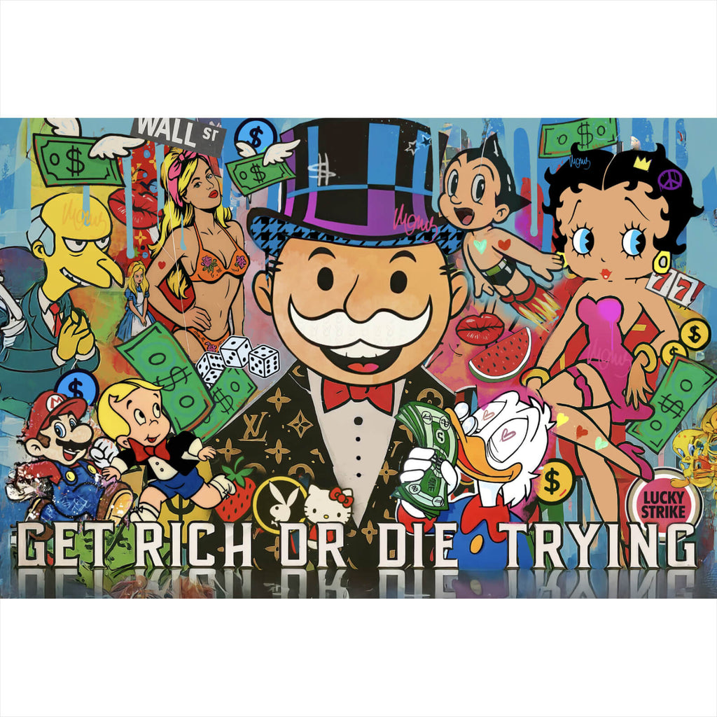 Das Bild zeigt eine bunte Pop-Art-Collage voller ikonischer Comic- und Zeichentrickfiguren, die um ein zentrales Monopoly-Maskottchen herum arrangiert sind. Dieses trägt einen Zylinder und lächelt fröhlich, während es von verschiedenen symbolischen Elementen umgeben wird, die Reichtum und Kapitalismus darstellen. Fliegende Geldscheine mit Flügeln schweben durch das Bild, während Würfel und Dollarzeichen die Glücksspielelemente unterstreichen. Bekannte Figuren wie die von klassischen Cartoons und Comics fügen sich in die bunte Szene ein, darunter ein fliegender Junge mit Raketenstiefeln und eine Frau im roten Kleid. Im Hintergrund sind weitere popkulturelle Referenzen zu erkennen, die das Bild mit einem Hauch von Nostalgie versehen. Unten im Bild verläuft der provokante Schriftzug "GET RICH OR DIE TRYING", der den kapitalistischen Unterton der Collage verstärkt. Die leuchtenden Farben Blau, Rot und Grün dominieren das Bild und verleihen ihm eine lebendige, energiegeladene Atmosphäre. Diese Collage bringt humorvoll die Themen Reichtum, Konsum und Popkultur zusammen und lädt den Betrachter ein, über die Symbole und ihre Bedeutung nachzudenken.