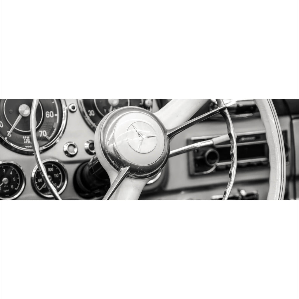 Diese beeindruckende Fotografie zeigt ein Vintage-Auto-Lenkrad in einem klassischen Retro-Design, das die Essenz von Nostalgie und Eleganz einfängt. Die Detailaufnahme des Lenkrads hebt die filigrane Mechanik und die kunstvoll gestalteten Instrumente des Cockpits hervor. Die geschwungenen Linien und die präzise Anordnung der Anzeigen versetzen den Betrachter in eine Zeit, in der Fahrzeuge noch echte mechanische Meisterwerke waren. Die Materialien und die Verarbeitung des Lenkrads strahlen eine zeitlose Qualität aus, die den Charme der Vergangenheit verkörpert. Die Fotografie fängt die Faszination für Oldtimer und das handwerkliche Können vergangener Tage ein und spricht sowohl Technikliebhaber als auch Kunstinteressierte an. Die Szene wirkt sowohl beruhigend als auch inspirierend und eignet sich perfekt als Kunstwerk in Räumen, die Stil und Geschichte vereinen möchten. Ideal für Büros, Wohnzimmer oder Hobbyräume, verleiht dieses Wandbild jedem Raum eine anspruchsvolle und zugleich nostalgische Atmosphäre. Die kunstvolle Komposition und die Liebe zum Detail machen dieses Bild zu einem beeindruckenden Mittelpunkt in jeder Umgebung.