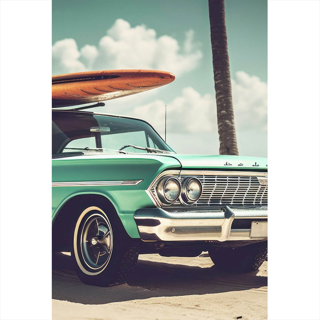 Dieses Wandbild zeigt ein beeindruckendes Vintage-Auto, das am Strand geparkt ist und ein Surfbrett auf dem Dach trägt. Die Szene strahlt ein Gefühl von Freiheit und Abenteuerlust aus, perfekt für Liebhaber des Retro-Lifestyles. Das Auto, mit seinen ikonischen Formen und Linien, verkörpert den klassischen Stil vergangener Jahrzehnte und zieht den Betrachter in eine Zeit des unbeschwerten Reisens. Der Hintergrund des Bildes, der die Weite des Strandes und das Meer andeutet, verstärkt das Gefühl von Entspannung und Urlaub, während die Präsenz des Surfbretts Abenteuer und die Sehnsucht nach dem nächsten Wellenritt symbolisiert. Die Gesamtkomposition des Bildes schafft eine harmonische Verbindung zwischen Mensch und Natur, Technik und Freiheit. Es eignet sich ideal für Räume, die eine inspirierende und nostalgische Atmosphäre schaffen möchten, sei es im Wohnzimmer, Büro oder Hobbyraum. Die Darstellung ist nicht nur ein visuelles Highlight, sondern auch ein Ausdruck eines Lebensgefühls, das zum Entdecken und Träumen einlädt. Diese detailreiche und kunstvolle Darstellung wird sicherlich die Fantasie anregen und jedem Raum eine einzigartige Note verleihen.