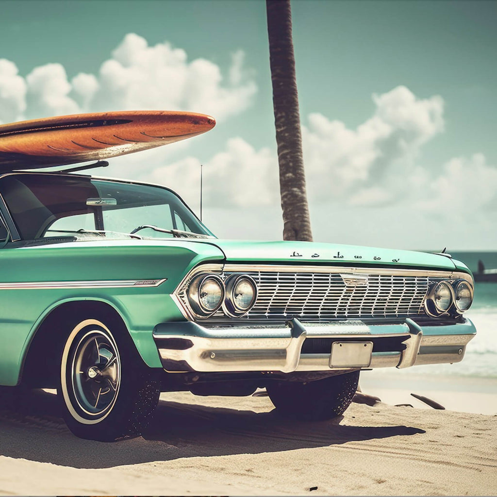 - Motivname: Vintage Auto mit Surfbrett am Strand