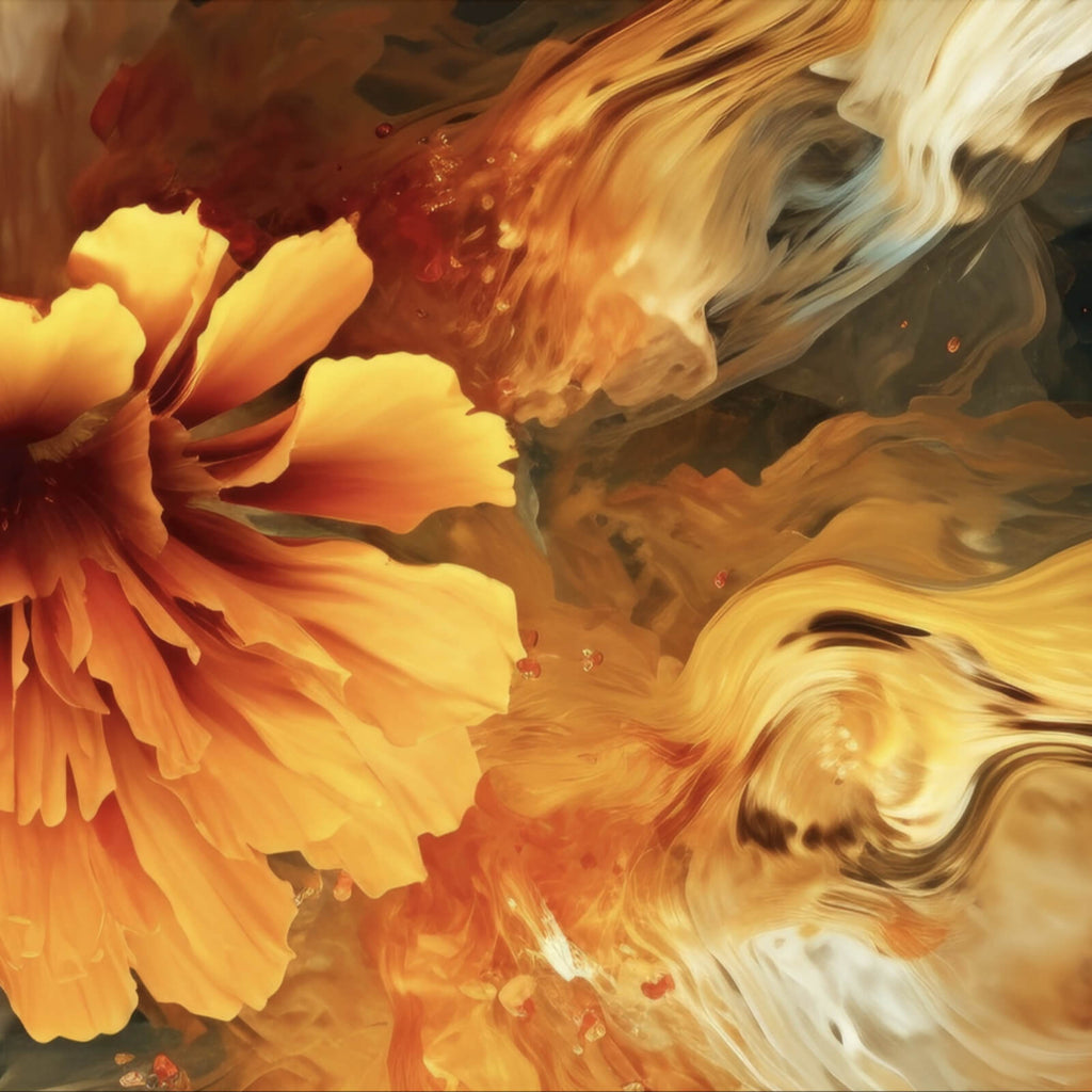 Dieses beeindruckende Wandbild zeigt eine faszinierende Symbiose aus abstrakter Kunst und floralen Elementen. Die dynamischen Wirbel und Strömungen der Fluidkunst erzeugen eine beeindruckende Tiefe und Bewegung, die den Betrachter in ihren Bann zieht. Die Komposition wird von einer stilisierten Blume dominiert, die im Mittelpunkt dieses Kunstwerks steht und eine harmonische Verbindung zwischen Natur und Abstraktion schafft. Die Bilddetails sind sorgfältig gestaltet, um eine beruhigende und dennoch kraftvolle Wirkung im Raum zu entfalten. Dieses Kunstwerk eignet sich ideal für moderne Wohnräume und Büros, da es eine ruhige, aber inspirierende Atmosphäre schafft. Die fließenden Formen und die kunstvolle Darstellung machen es zu einem Blickfang, der sowohl Kreativität als auch Ruhe verkörpert. Es ist die perfekte Wahl für alle, die ihrer Einrichtung eine elegante und zeitgemäße Note verleihen möchten, und bietet eine exquisite Möglichkeit, die Wände eines Wohnzimmers, Schlafzimmers oder Büros zu verschönern. Die harmonische Kombination aus Bewegung und floralen Elementen verleiht dem Bild eine einzigartige Ästhetik, die sowohl beruhigend als auch anregend wirkt und es zu einem idealen Element für die visuelle Raumgestaltung macht.