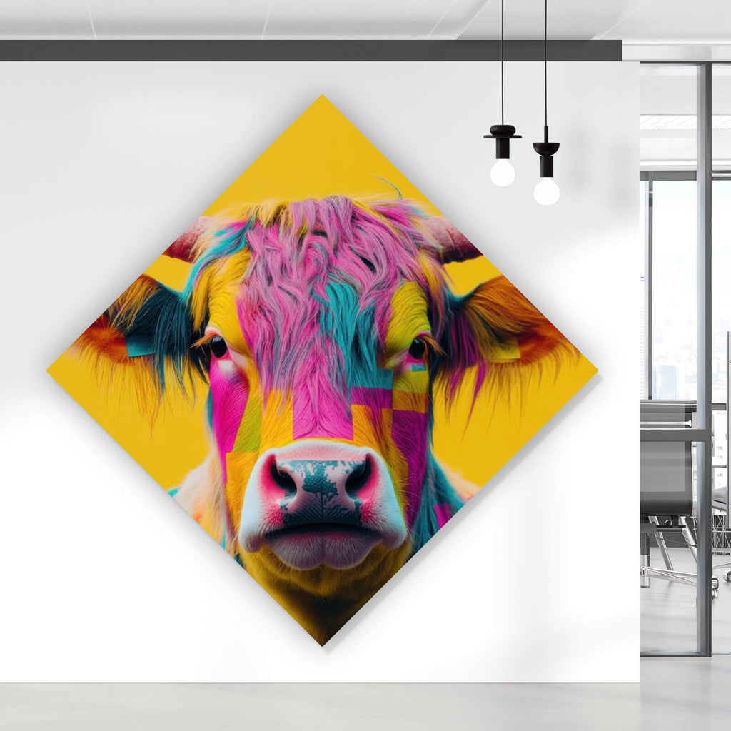 Das Spannrahmenbild Buntes modernes Hochlandrind vor gelben Hintergrund als Raute gehört mit großem Abstand zu den edelsten Wandbildvarianten. Textilspannrahmen, oft auch Frameless, Aluframes oder Textilspannrahmen genannt, sind die perfekte Kombination aus einem 25 mm starken eloxiertem Aluminiumrahmen und einem hochwertigen Sublimationsdruck auf einem Textil Banner. Der leichte Alurahmen, das Textilbanner mit Gummilippe und eine Aufhängung gibt es bei uns im praktischen Komplettset. Spannbilder sind eine großartige Alternative zu allen anderen Wandbild Arten und vermitteln eine luxuriöse und anmutende Ausstrahlung. Auch ein kurzfristiger Motivwechsel ist mit einem Spannrahmenbild kein Problem mehr, da die Drucke einfach austauschbar sind. Da sich der Rahmen ja dann bereits im Besitz befindet, kann einfach ein passender Ersatzdruck kostengünstig nachbestellt werden, selbstverständlich auch mit einem anderen Motiv. Im Handumdrehen erstrahlt die Wand in neuem Glanz. Der Textildruck ist B1 zertifiziert und somit auch ideal für Gewerbe, Büro oder Praxis. Spannrahmenbilder, die auch nach Jahren noch wie neu aussehen und strahlen.