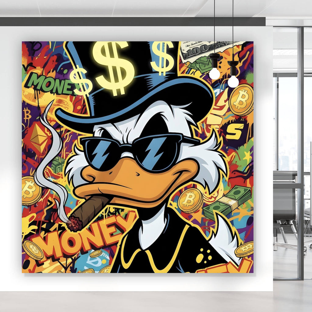 Dieses Wandbild zeigt eine ikonische Zeichentrickfigur in einem modernen Pop Art Stil, der die Themen Geld und Reichtum humorvoll in Szene setzt. Die Figur trägt einen hohen Hut mit auffälligen Dollarzeichen und hält eine Zigarre, was den Luxus und den Kapitalismus symbolisiert. Umgeben von verschiedenen Geldsymbolen und Banknoten vermittelt das Bild eine starke Aussage über Wohlstand und Erfolg. Der Comic-Stil kombiniert mit kräftigen Linien und dynamischen Formen schafft eine energiegeladene und lebendige Atmosphäre. Die Bildkomposition nutzt verschiedene Elemente aus der Popkultur, um eine fantasievolle und zugleich provokante Darstellung zu schaffen, die Aufmerksamkeit erregt und zum Nachdenken anregt. Ideal für moderne Wohnräume, Büros oder Bars, verleiht es jedem Raum eine besondere Note und dient als Gesprächsstarter. Die Mischung aus Humor und künstlerischem Ausdruck macht es zu einem vielseitigen Kunstwerk, das sowohl in persönlichen als auch in geschäftlichen Umgebungen einen einzigartigen Akzent setzt.