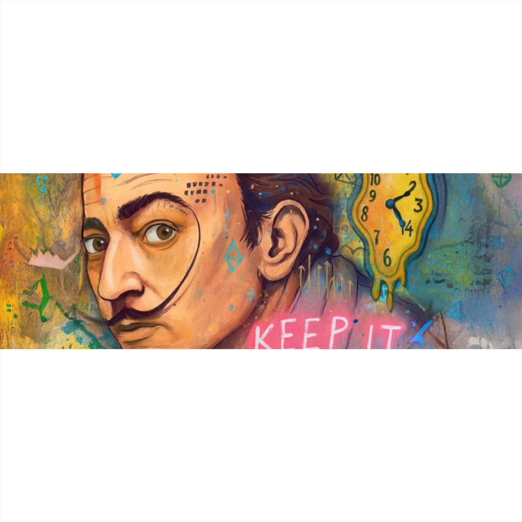 Dieses eindrucksvolle Wandbild vereint die Essenz des Surrealismus mit moderner Pop Art und bietet ein faszinierendes visuelles Erlebnis. Im Mittelpunkt steht das ausdrucksstarke Portrait eines Mannes, dessen Gesichtszüge stark an einen bekannten Künstler erinnern. Die schmelzende Uhr, ein klassisches Symbol der Vergänglichkeit der Zeit, fügt dem Bild eine tiefere Bedeutungsebene hinzu. Verspielte Elemente wie geometrische Formen und ein grinsendes Krokodil verleihen dem Werk eine zusätzliche Dimension der Fantasie und Kreativität. Der neonartige Schriftzug „Keep it Surreal Baby“ betont das Motiv des Surrealismus und der künstlerischen Freiheit. Die Kombination aus verschiedenen Stilen und Elementen schafft eine dynamische Komposition, die sowohl ansprechend als auch anregend ist. Die Materialanmutung des Bildes vermittelt einen handgemachten, künstlerischen Eindruck, der Tiefe und Textur verleiht. Dieses Wandbild eignet sich ideal für Räume, die eine kreative und inspirierende Atmosphäre fördern sollen, wie Wohnzimmer, Büros oder kreative Arbeitsumgebungen. Die kraftvolle und einzigartige Darstellung zieht die Aufmerksamkeit auf sich und regt zur Reflexion über die Konzepte von Zeit, Realität und Kunst an. Dieses exklusive Kunstwerk ist ein Muss für Liebhaber moderner und surrealistischer Kunst, die ihren Räumen einen Hauch von Originalität und Ausdruckskraft verleihen möchten.