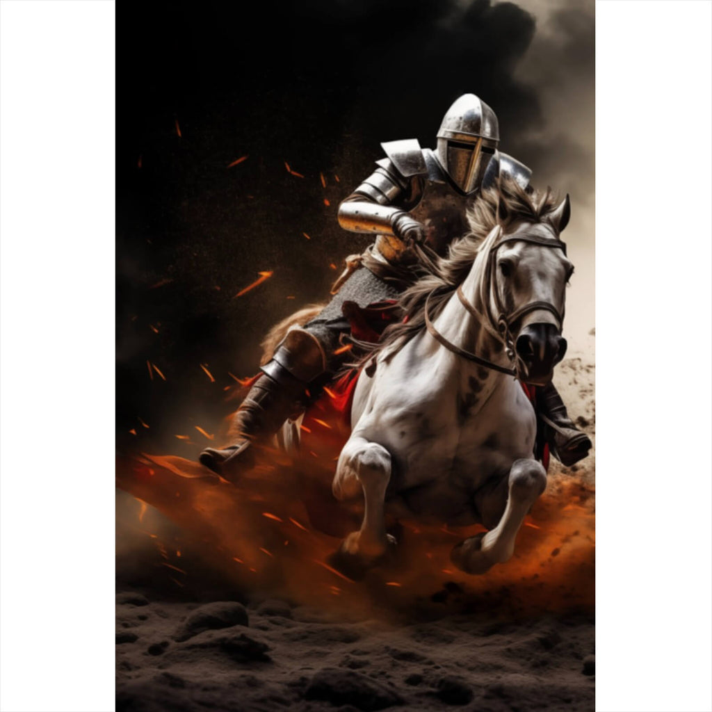 Dieses beeindruckende Wandbild zeigt zwei Ritter in voller Rüstung, die auf kraftvollen Pferden inmitten einer dynamischen und spannungsgeladenen Szene reiten. Die Darstellung fängt die Essenz eines mittelalterlichen Kampfes ein, wobei die Reiter mit entschlossener Miene und gezogenen Waffen aufeinander zujagen. Die Bewegung der Pferde ist eindrucksvoll eingefangen, der aufgewirbelte Staub verleiht dem Bild eine zusätzliche dynamische Tiefe und verstärkt das Gefühl von Geschwindigkeit und Intensität. Die Rüstungen der Ritter glänzen im Licht, was einen starken Kontrast zur rauen Umgebung bildet. Dieses kunstvolle Werk fesselt den Betrachter durch seine lebendige Darstellung von Stärke und Tradition. Der epische Charakter der Szene wird durch die dramatische Komposition unterstrichen, die sowohl Spannung als auch historische Authentizität vermittelt. Ideal für Räume, die eine Atmosphäre von Abenteuer und Energie ausstrahlen sollen, zieht dieses Bild alle Blicke auf sich und verleiht jedem Raum eine eindrucksvolle Präsenz. Die Balance zwischen den kraftvollen Formen und der feinen Detailgenauigkeit macht es zu einem perfekten Gesprächsstück und einem Muss für Liebhaber von historischen und dramatischen Kunstwerken.