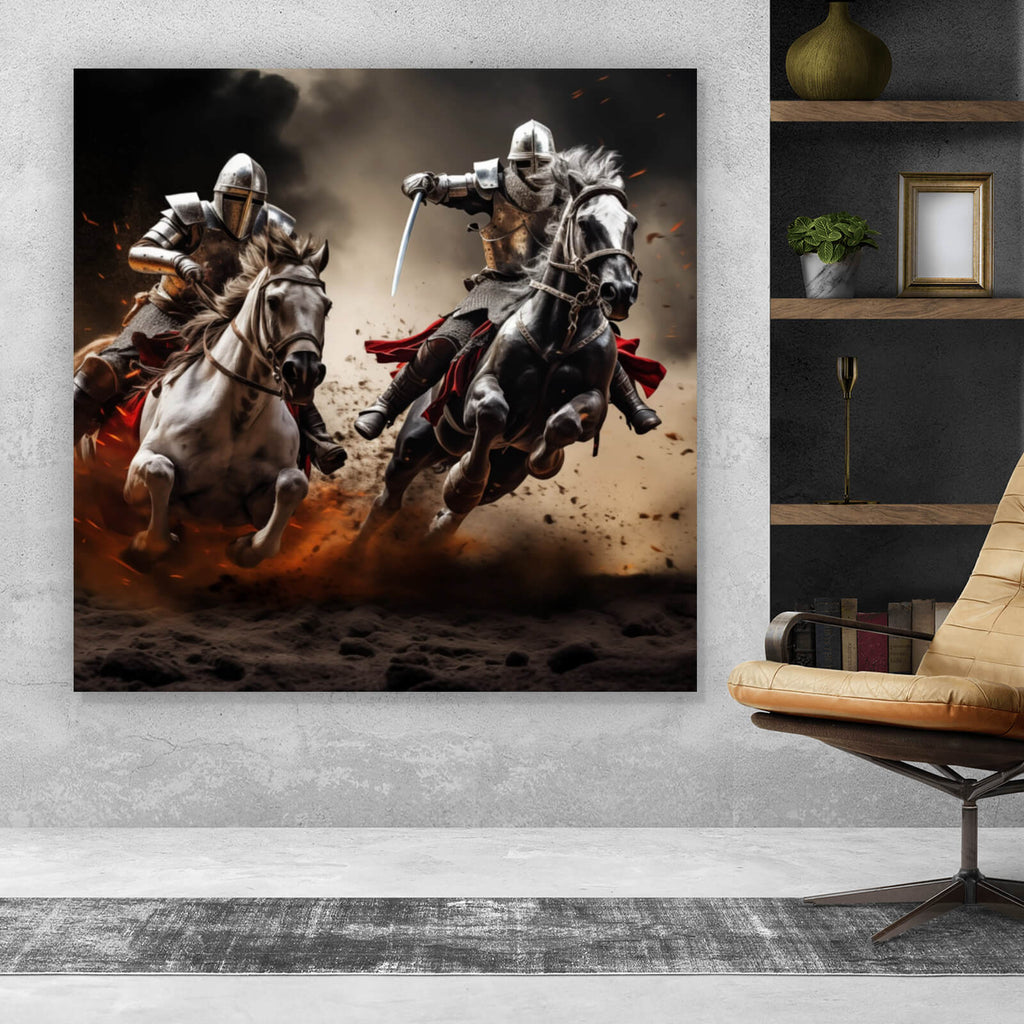 Dieses beeindruckende Wandbild zeigt zwei Ritter in voller Rüstung, die auf kraftvollen Pferden inmitten einer dynamischen und spannungsgeladenen Szene reiten. Die Darstellung fängt die Essenz eines mittelalterlichen Kampfes ein, wobei die Reiter mit entschlossener Miene und gezogenen Waffen aufeinander zujagen. Die Bewegung der Pferde ist eindrucksvoll eingefangen, der aufgewirbelte Staub verleiht dem Bild eine zusätzliche dynamische Tiefe und verstärkt das Gefühl von Geschwindigkeit und Intensität. Die Rüstungen der Ritter glänzen im Licht, was einen starken Kontrast zur rauen Umgebung bildet. Dieses kunstvolle Werk fesselt den Betrachter durch seine lebendige Darstellung von Stärke und Tradition. Der epische Charakter der Szene wird durch die dramatische Komposition unterstrichen, die sowohl Spannung als auch historische Authentizität vermittelt. Ideal für Räume, die eine Atmosphäre von Abenteuer und Energie ausstrahlen sollen, zieht dieses Bild alle Blicke auf sich und verleiht jedem Raum eine eindrucksvolle Präsenz. Die Balance zwischen den kraftvollen Formen und der feinen Detailgenauigkeit macht es zu einem perfekten Gesprächsstück und einem Muss für Liebhaber von historischen und dramatischen Kunstwerken.