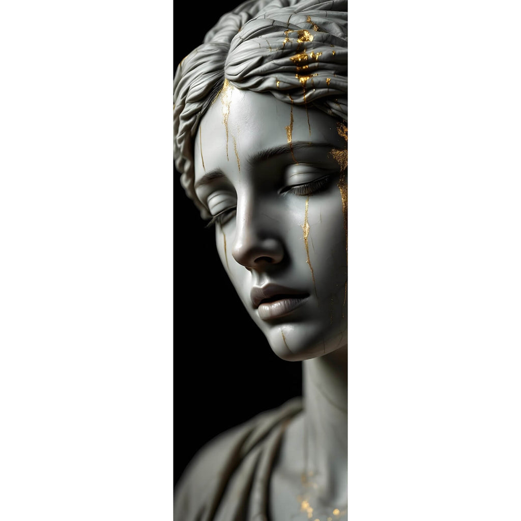 Dieses Wandbild zeigt eine edle und moderne Skulptur mit beeindruckenden goldenen Akzenten, die dem Kunstwerk eine luxuriöse und elegante Anmutung verleihen. Das Motiv, ein ausdrucksstarkes Gesicht, zieht den Betrachter mit seiner tiefen und nachdenklichen Ausstrahlung in seinen Bann. Die kunstvoll gestalteten Details und die harmonische Formgebung der Skulptur schaffen eine einzigartige Ästhetik, die sowohl modern als auch zeitlos wirkt. Die feinen Risse und Linien im Material verleihen dem Werk Tiefe und Charakter und fügen sich nahtlos in die Gesamtkomposition ein. Diese künstlerische Darstellung eignet sich perfekt als stilvolle Dekoration für Räume wie Büros, Wohnzimmer, und Schlafzimmer, wo sie eine inspirierende und meditative Atmosphäre schafft. Die goldenen Akzente heben sich effektvoll vom Hintergrund ab und sorgen für ein faszinierendes Spiel von Licht und Schatten, das die Raumwirkung verstärkt. Dieses Kunstwerk spricht Kunstliebhaber an, die Wert auf hochwertige und ausdrucksstarke Dekoration legen, und ist ein ideales Element, um jedem Interieur eine besondere Note zu verleihen.